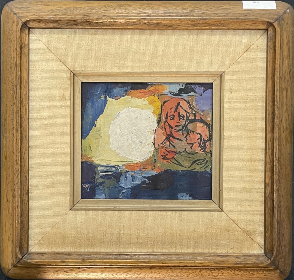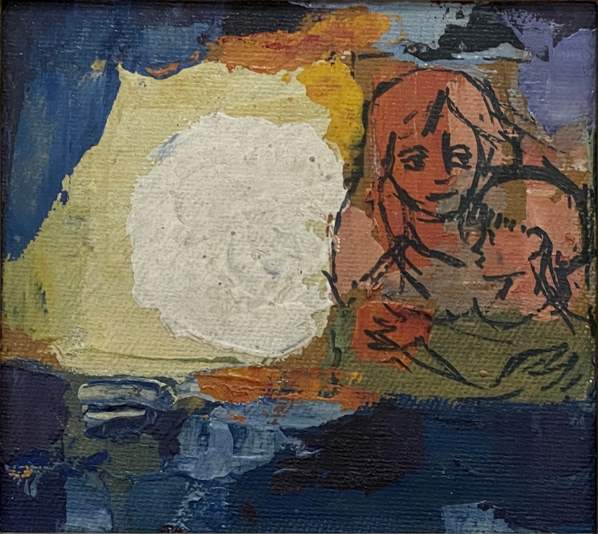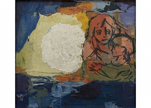 קרלוס מונטנייז - 'אם ובת תחת הלבנה במילואה' - ציור ישן, רישום טוש ושמן על בד צרפתי, לא חתום (מקור עיזבון גלריסט שייצג את האמן), מידות: 13X14 ס"מ, מידות המסגרת: 30.5X31 ס"מ.