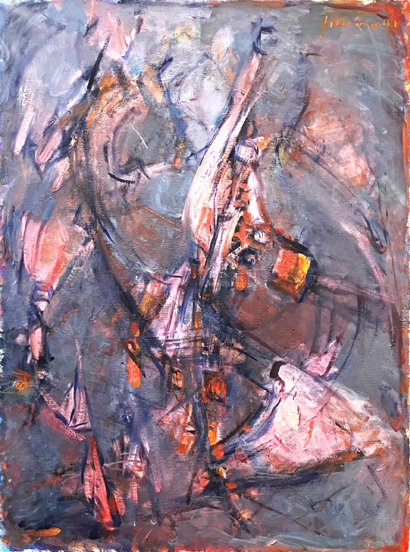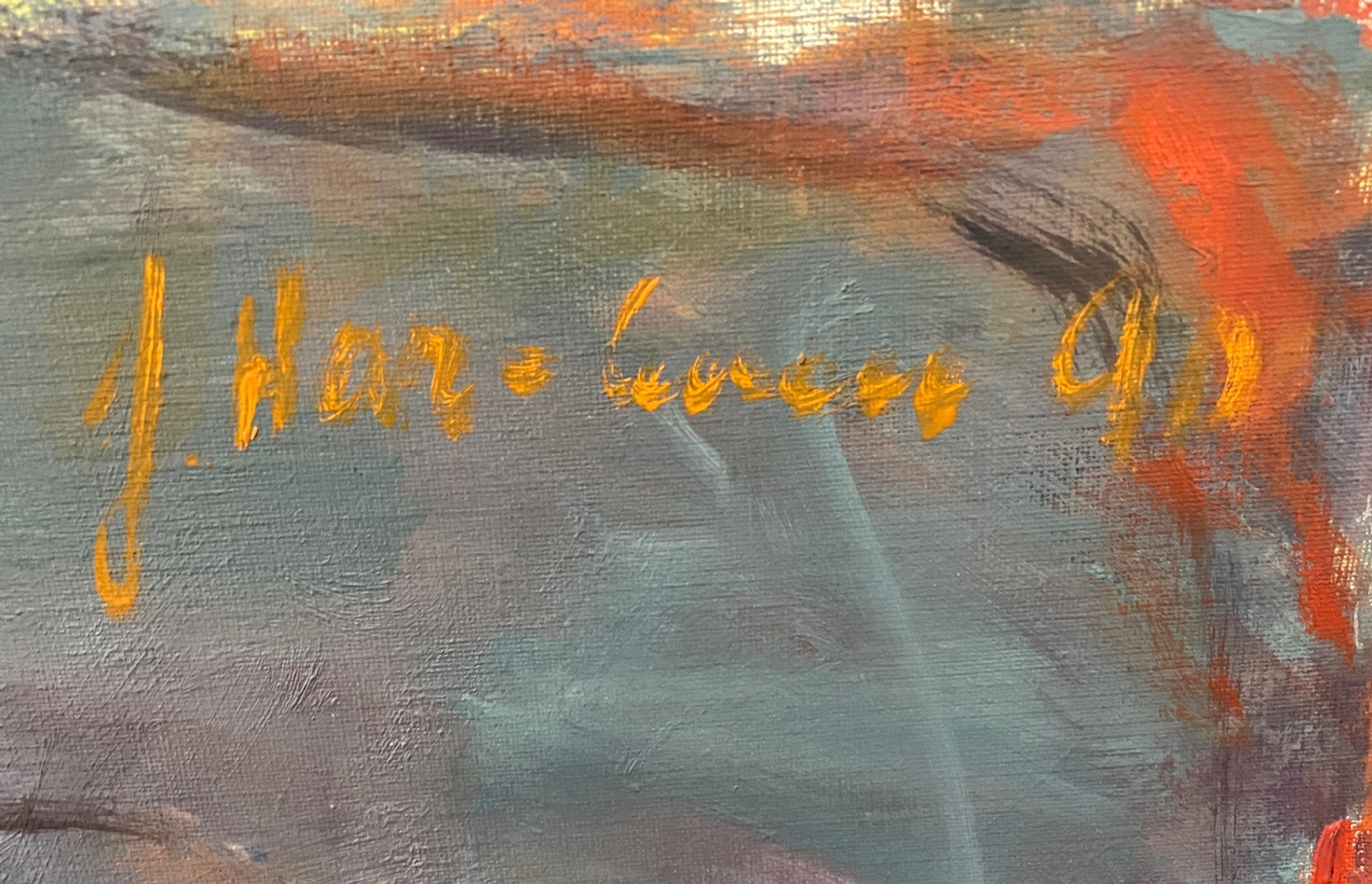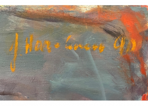 הר אבן, יהודית (Yehudit Har-Even) - 'דוד והנבל' - ציור גדול מיימדים, שמן על בד, חתום ומתוארך: 1990, מידות: 130X97 ס"מ.