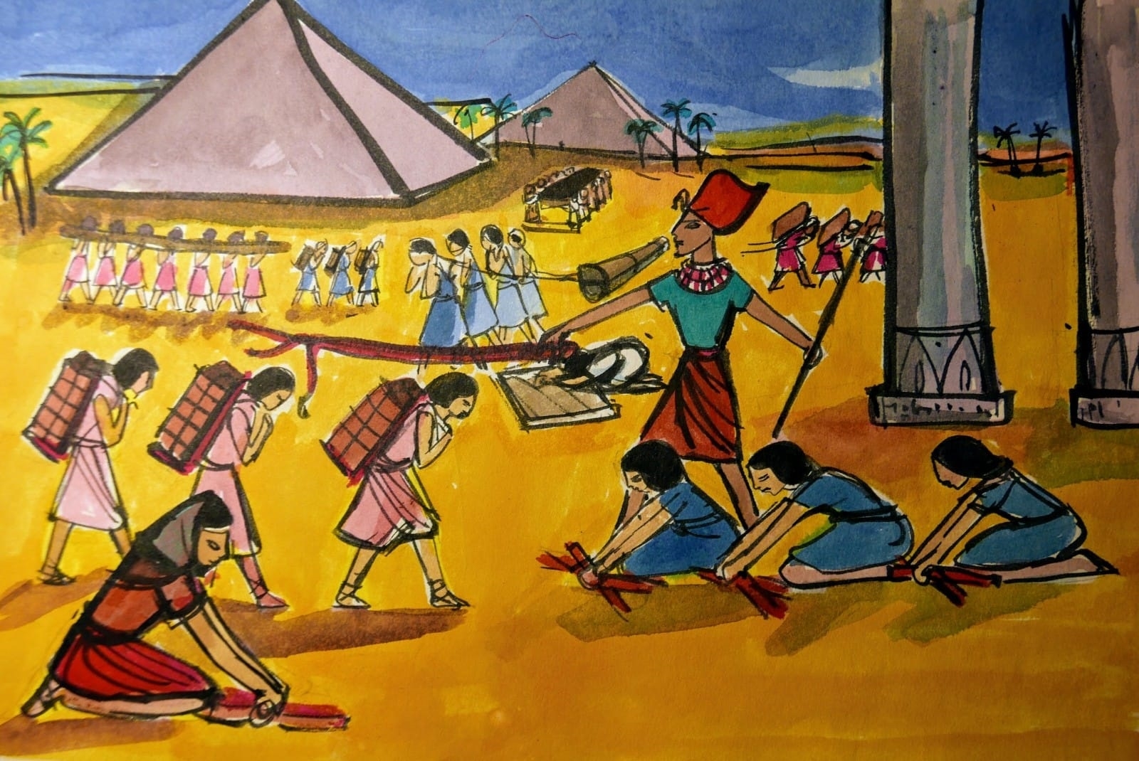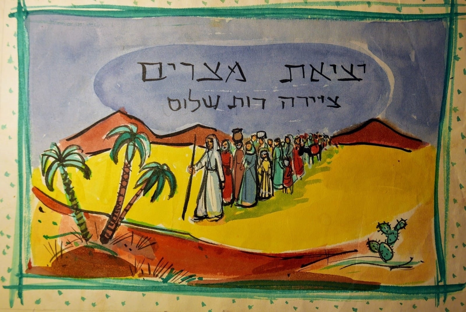 רות שלוס, (Ruth Schloss) - ציור ישן, מתוך סדרת איורים למצגות לילדים משנות ה-50 בנושא יציאת מצרים, אקוורל וגואש על נייר, לא חתום, מידות: 26X35 ס"מ. (לא ממוסגר). * מצורף להמחשה בלבד צילום שער הסדרה אליו שייך איור זה שעליו כן חתמה רות שלוס.