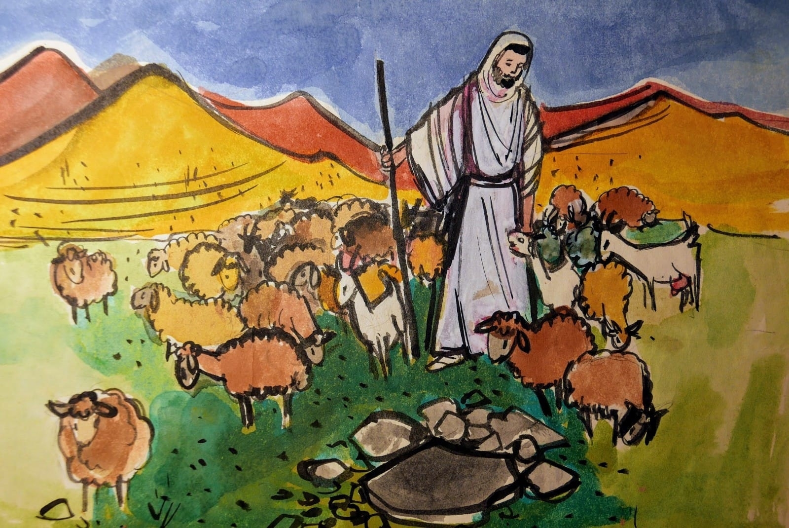 רות שלוס, (Ruth Schloss) - ציור ישן, מתוך סדרת איורים למצגות לילדים משנות ה-50 בנושא יציאת מצרים, אקוורל וגואש על נייר, לא חתום, מידות: 26X35 ס"מ. (לא ממוסגר). * מצורף להמחשה בלבד צילום שער הסדרה אליו שייך איור זה שעליו כן חתמה רות שלוס.