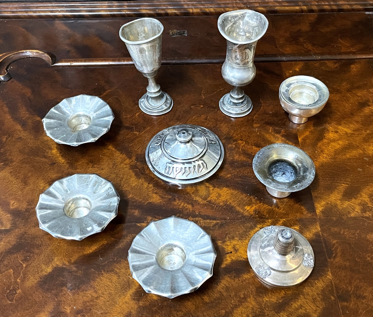 לוט חפצי כסף ישנים שונים (פגומים), חתומים, משקל כולל: 146 גרם סה"כ, גובה הגביע הגבוה: 9.5 ס"מ.