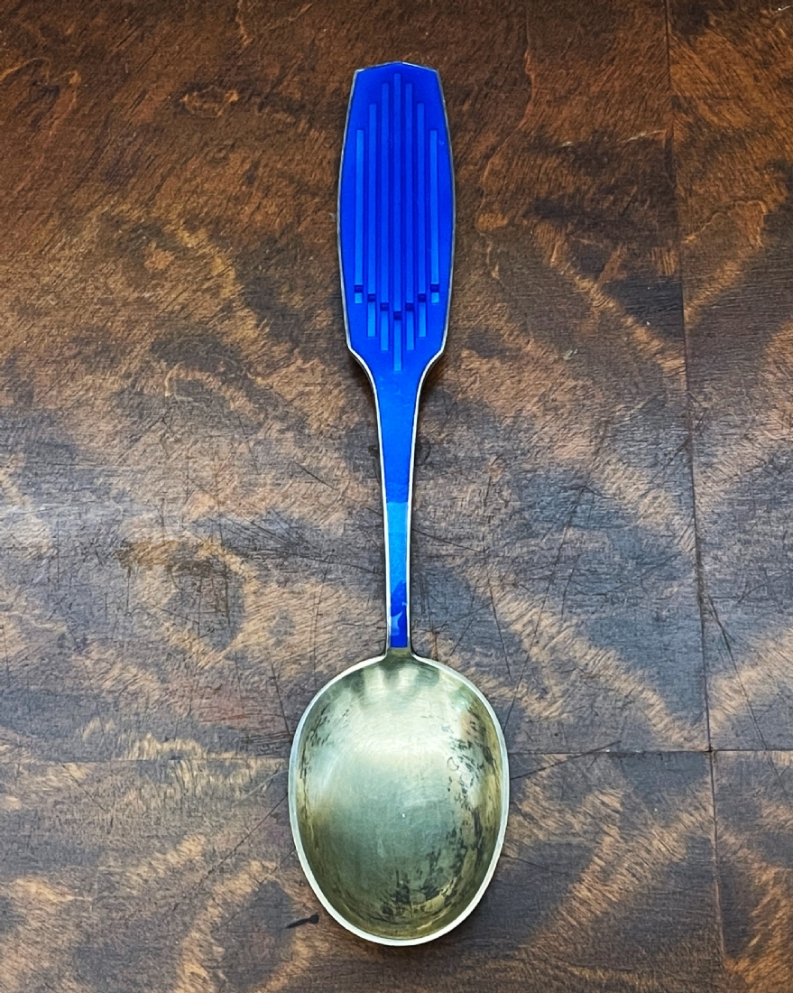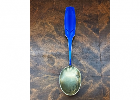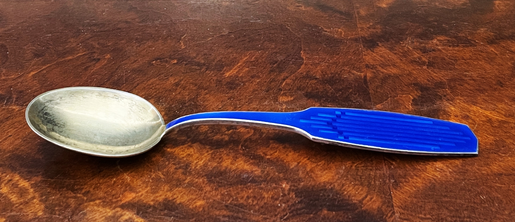 לאספנים - כף כסף דנית איכותית מתוצרת: 'Anton Michelsen', עשויה כסף 'סטרלינג', מוזהבת ומעוטרת באמייל 'גיושה' (Guilloche) כחול בדגם 'צינורות עוגב' (Organ Pipes), יוצרה לכבוד חג המולד של שנת 1961 (Christmas spoon), משקל: 49.45 גרם, אורך: 17 ס"מ.