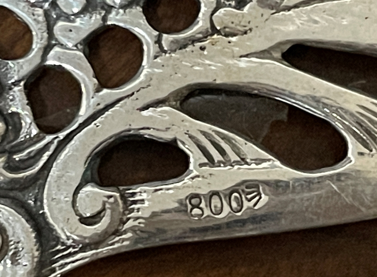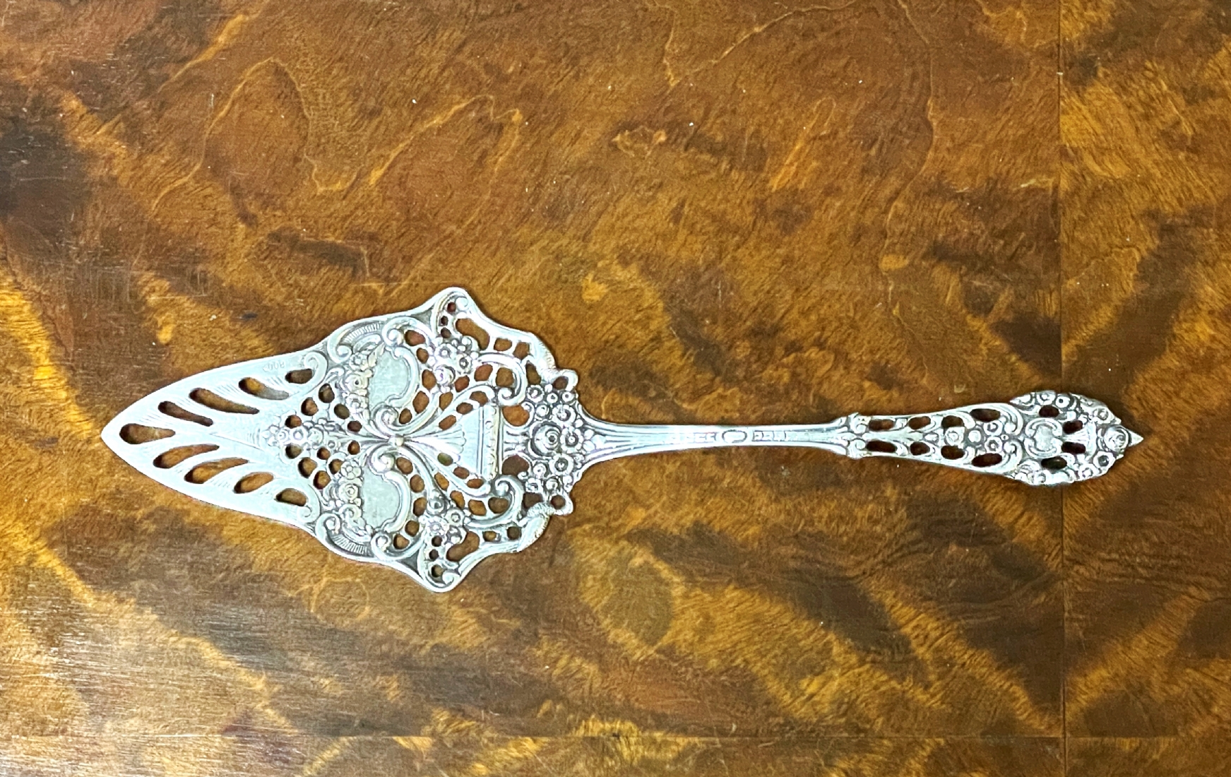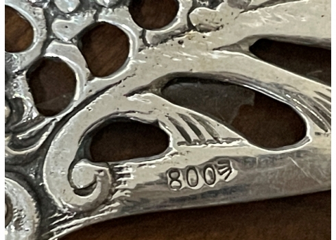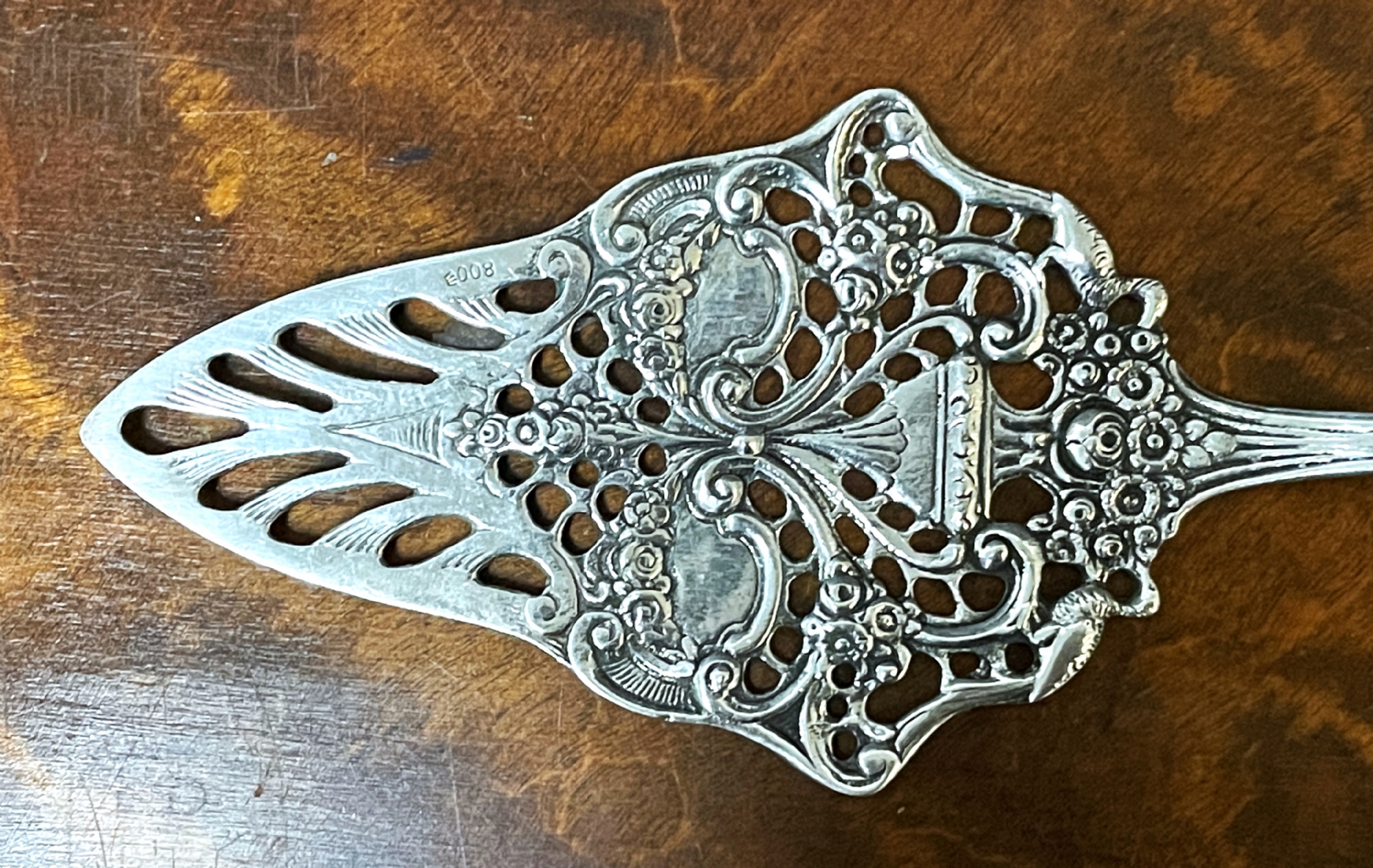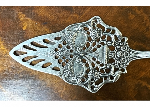 כף לעוגה עשויה כסף '800', חתום, מעוטרת עיטורי בלט בדגם של אגרטל פרחים, משקל: 47 גרם, אורך: 22 ס"מ.