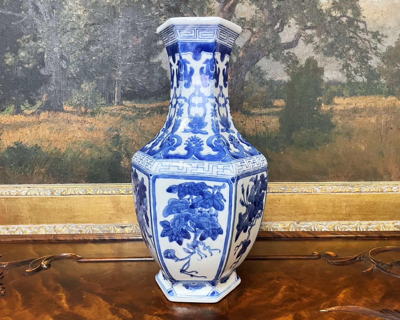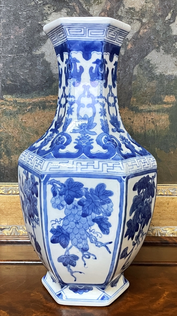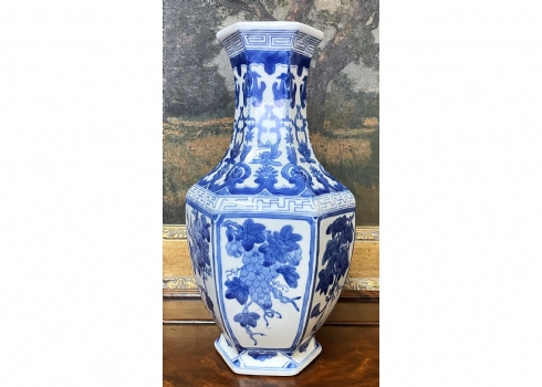 כד פורצלן סוני בעל שש פאות, מעוטר בצבעי כחול ולבן, רוחב: 18 ס"מ, גובה: 36 ס"מ.