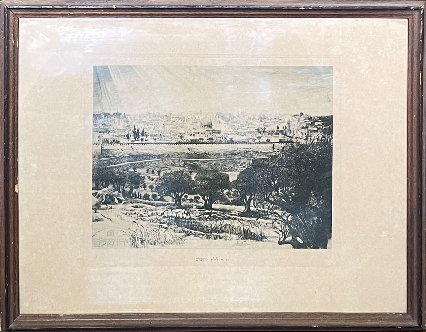 אפרים משה ליליאן (ליליין 1874-1925) - ירושלים. תחריט, חתום בלוח, נדפס על נייר צהבהב. מצב טוב מאד, מידות: 26x34 ס"מ. מסגרת עץ וזכוכית 29x37.5 ס"מ.