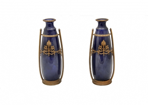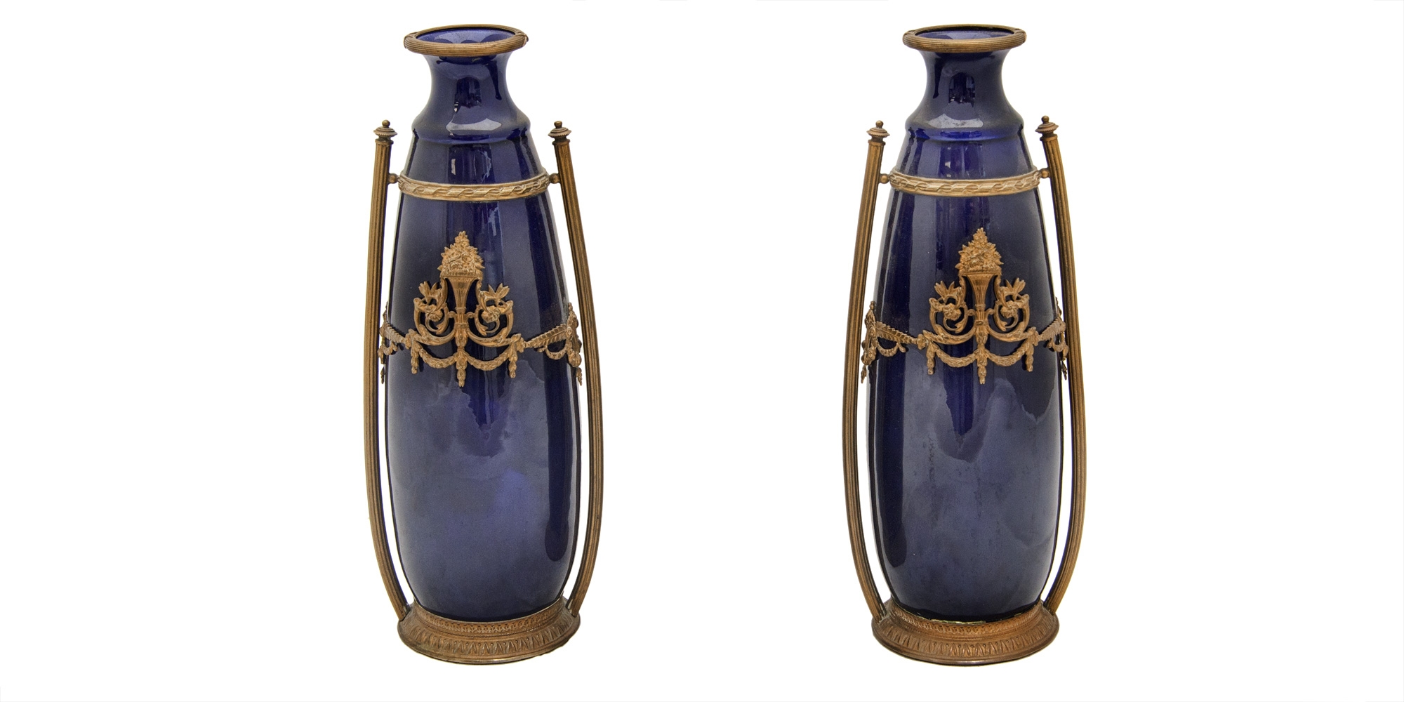 זוג כדים צרפתים עתיקים מעוטרים התקני פליז, לא חתומים, גובה: 28,5 ס"מ.
