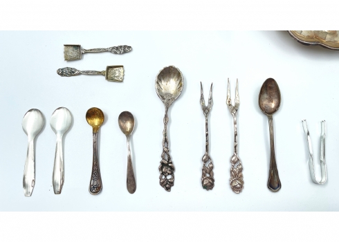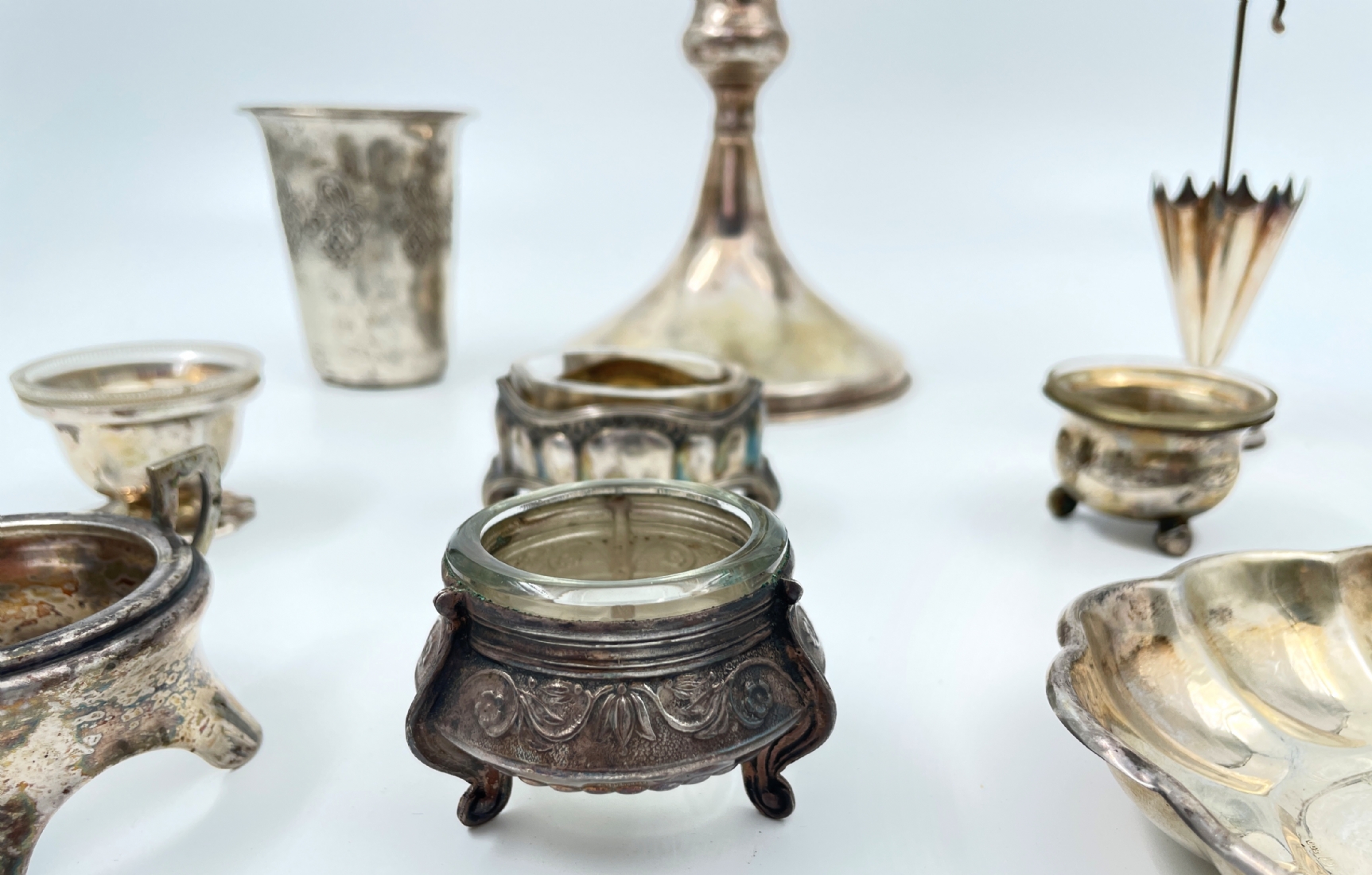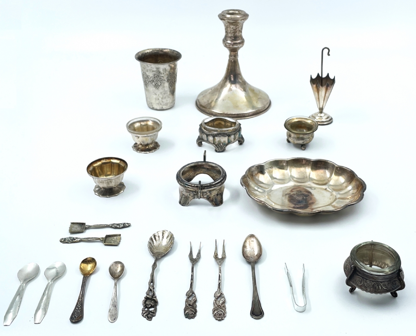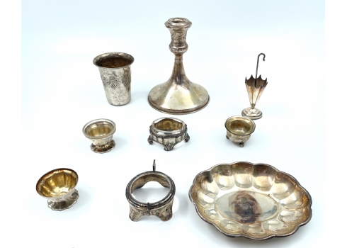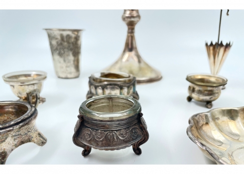 לוט של 16 פרטי כסף ישנים שונים חתומים רובם כסף '800', רק מה שעשוי כסף שוקל 330 גרם + עוד 2 פריטים מוכבדים (מעמד לקיסמים בצורת מטרייה וכלי למלח עם זכוכית בתוכו במשקל כולל של 94 גרם רק שניהם) שאר החלקים שאינם כסף לא נשקלו, קוטר בסיס הפמוט הגדול: 12 ס"מ, גובה הפמוט: 15 ס"מ, גובה כוס הקידוש: 8 ס"מ.