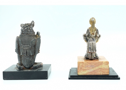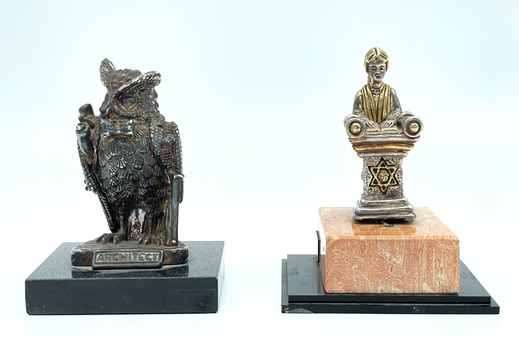 זוג פסלוני כסף שונים, עשויים כסף 'סטרלינג' (חתומים 925), אחד בדמות ינשוף מלומד והשני בדמות נערה בבת המצווה (מתוצרת 'בן ציון'), גובה כולל בסיסי האבן בהתאמה: 14 ס"מ, 15.5 ס"מ.