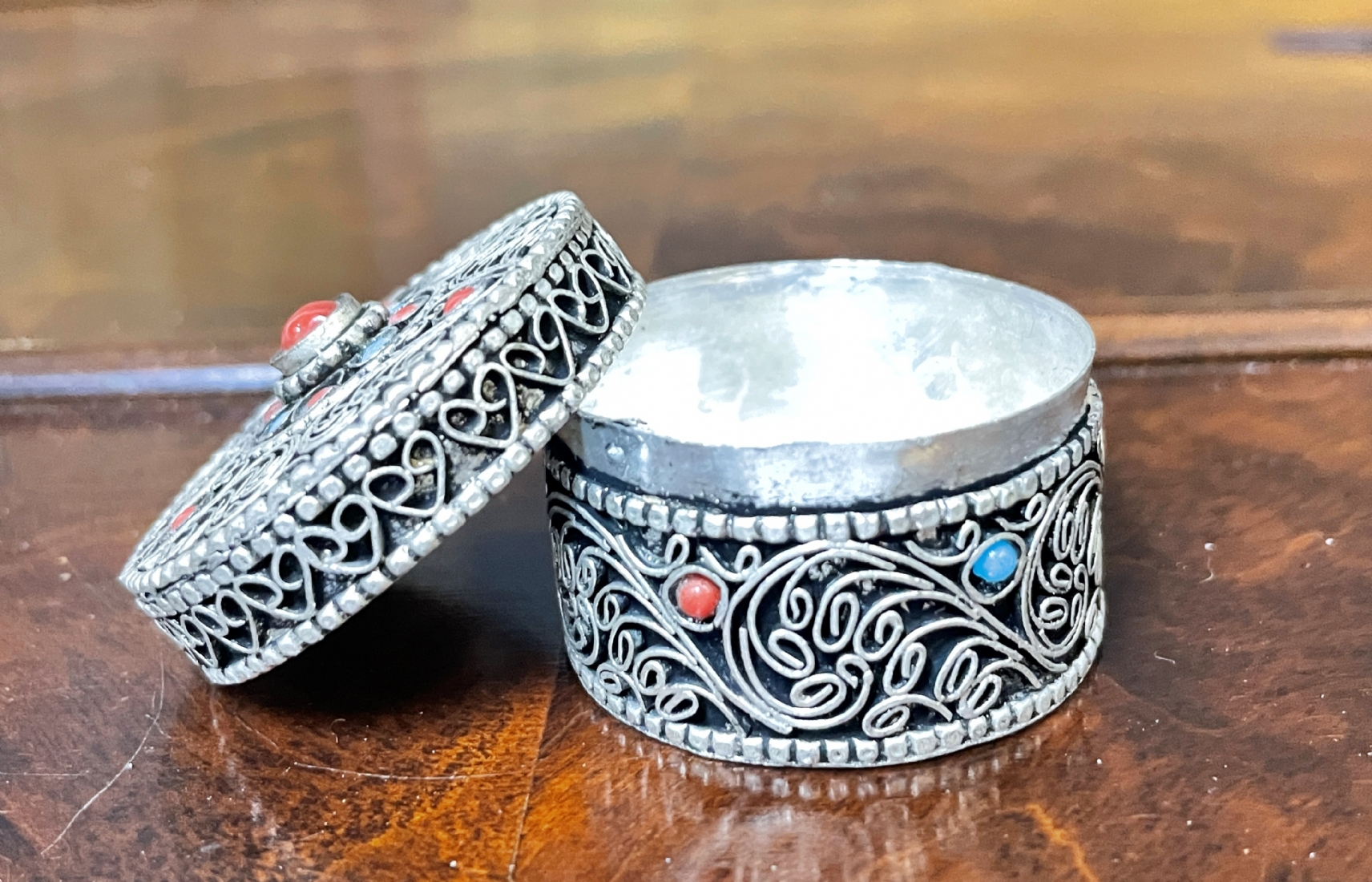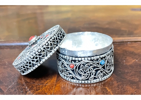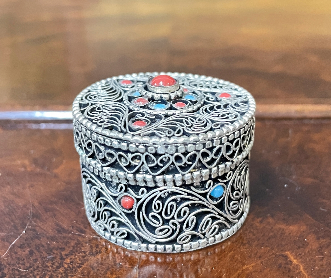 קפסא עגולה קטנה בסגנון טורקמני, עשויה כסף נמוך, מעוטרת עיטורי פיליגראן ומשובצת אבנים צבעוניות, לא חתומה, גובה כולל המכסה: 3 ס"מ, קוטר: 3.5 ס"מ.