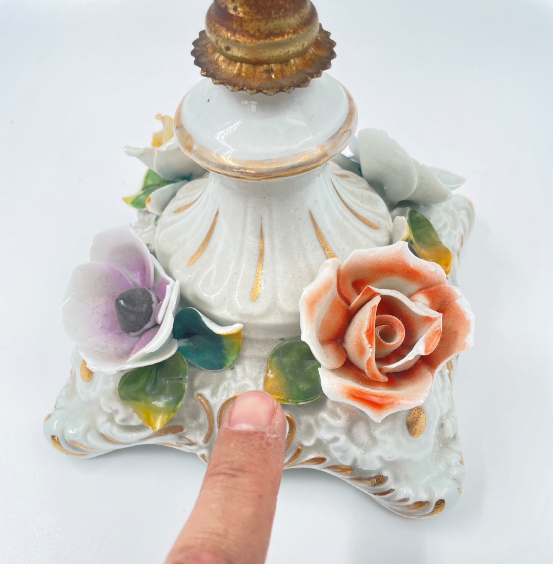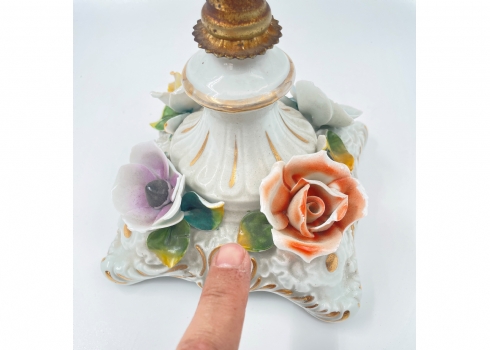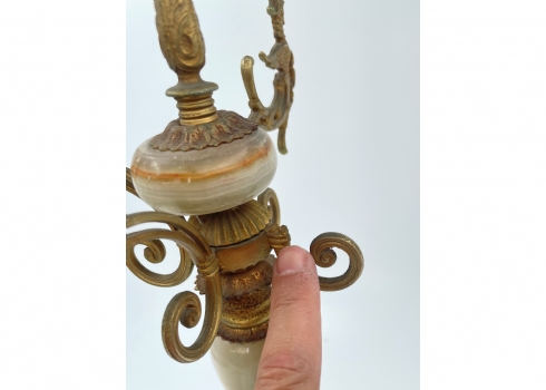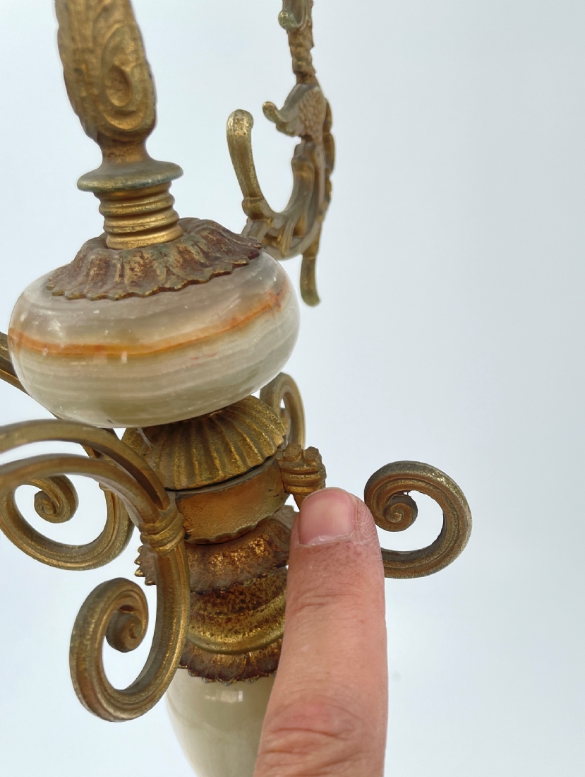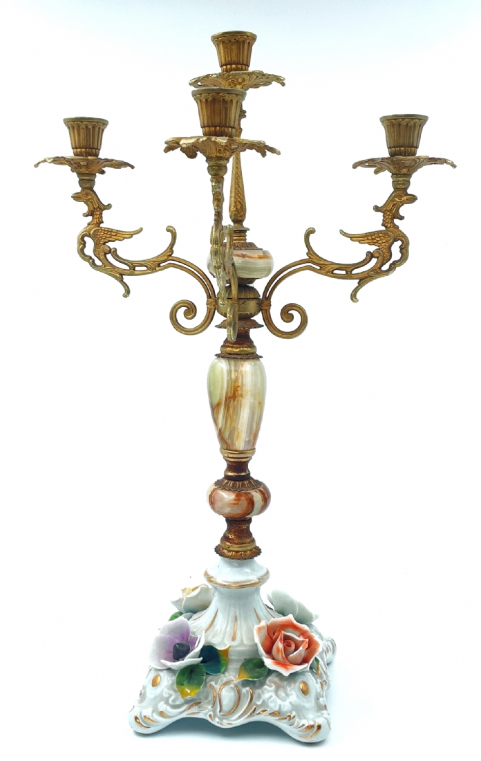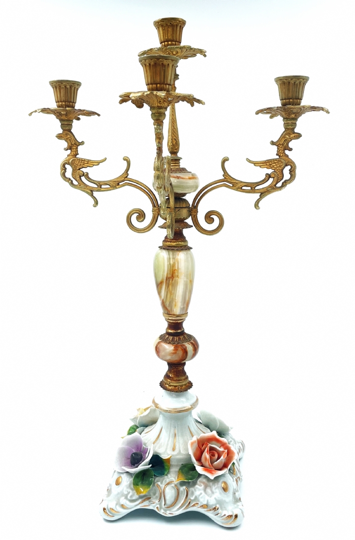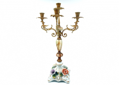 פמוט רב קני (קנדלברה) איטלקי ישן, עשוי פליז פורצלן ואוניקס מצרי בגווני ירוק וחום, זרוע אחת חסרה, מספר פגמים לעלי הכותרת של הפרחים, לא חתום, רוחב: 31 ס"מ, גובה: 51 ס"מ.