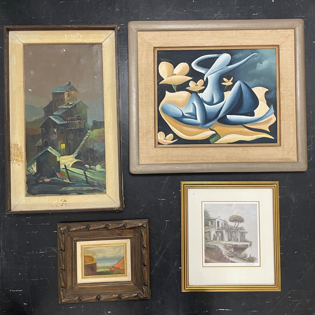 לוט של 4 ציורים ישנים שונים, טכניקות: שמן על בד, שמן על בד, שמן על לוח, ליטוגרפיה חתומה בעיפרון, מצב בהתאם לגיל, מידות הציור הגדול: 40X50 ס"מ, מידות התמונה המאורכת: 63X62 ס"מ.