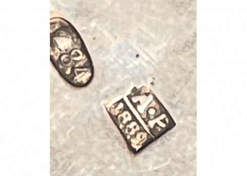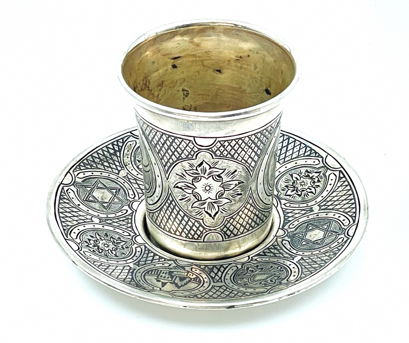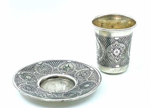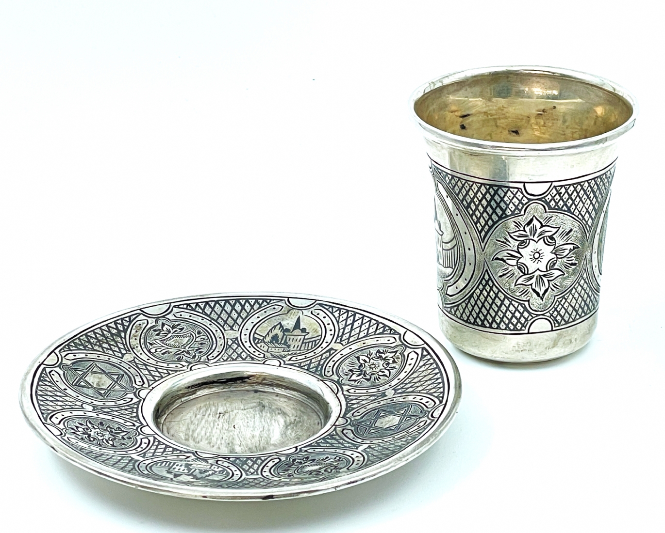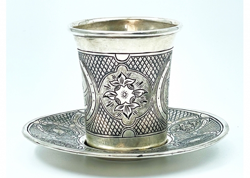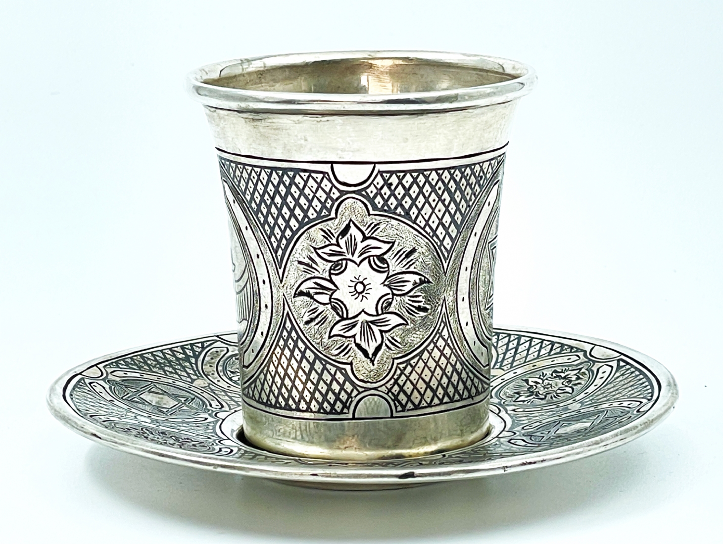 כוס כסף רוסית ותחתית תואמת, מעוטרת 'ניילו' (Niello) שחור, חתום, משקל כולל: 214 גרם סה"כ, קוטר הצלחת: 12 ס"מ, גובה הכוס: 7.5 ס"מ.