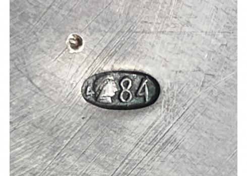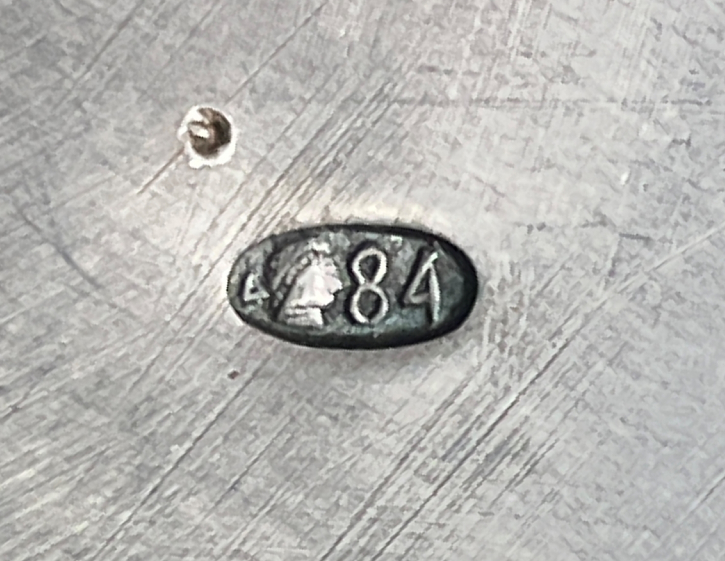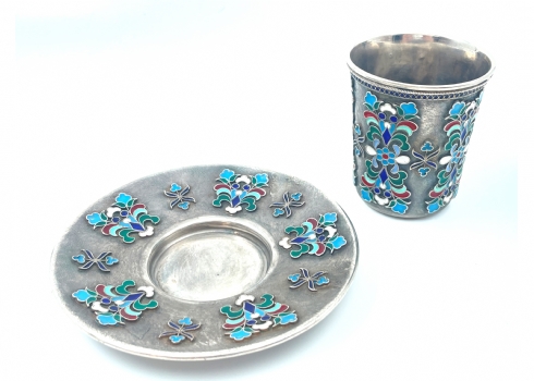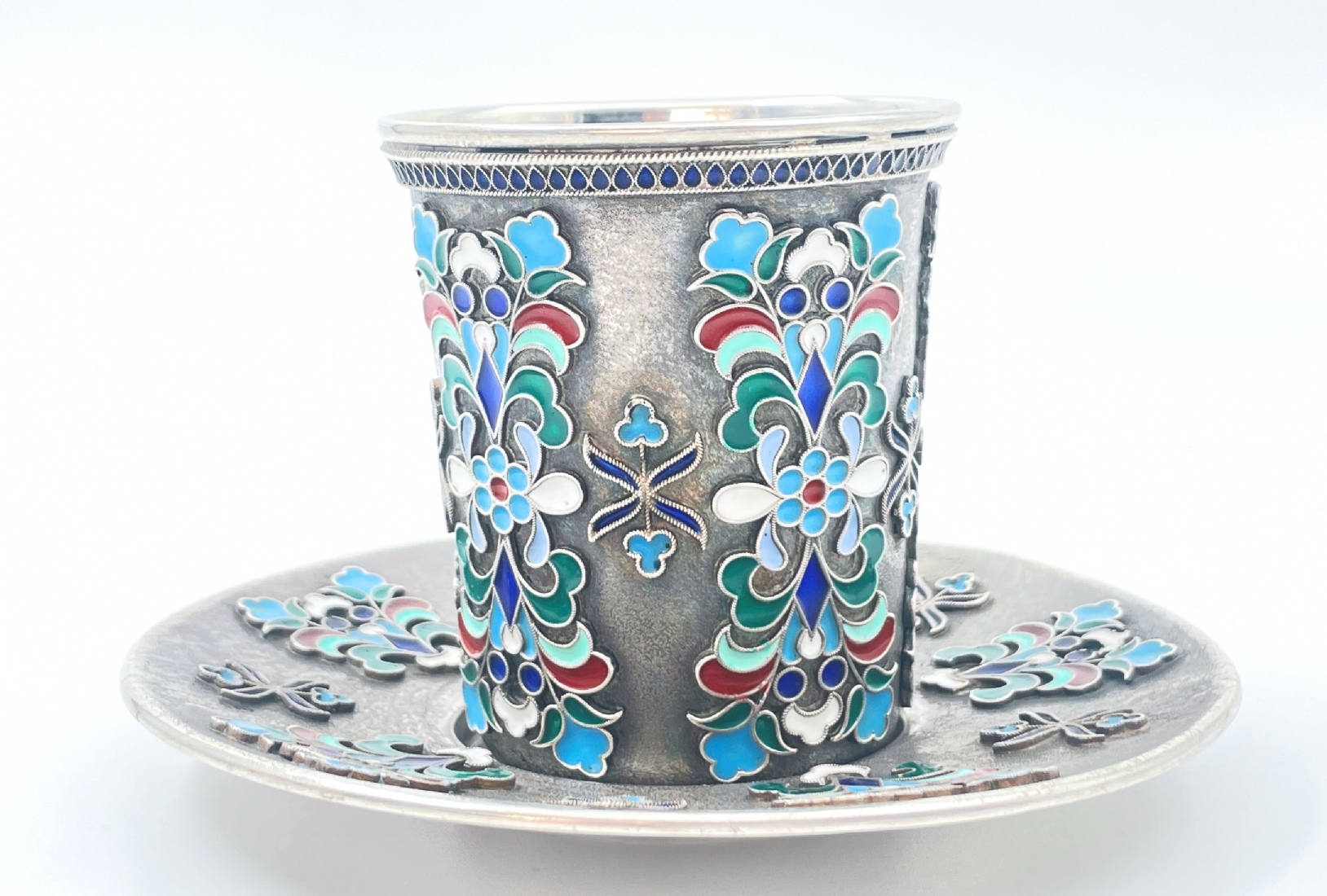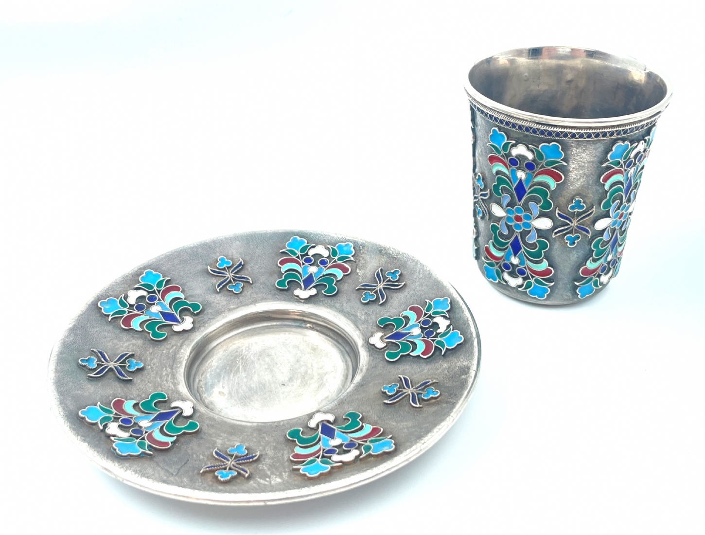 כוס כסף רוסית ותחתית תואמת, מעוטרת 'אמייל קלואזונה' (Cloisonne) צבעוני, חתום, משקל כולל: 301 גרם סה"כ, קוטר הצלחת: 14 ס"מ, גובה הכוס: 8.5 ס"מ.