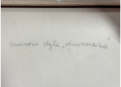 גרטי רובינשטיין רוטמן (Gerti Rubinstein) - 'גבר שיכור ושתי נשים מרוצות' - ציור ישן, שמן על בד, חתום, מידות: 49X59 ס"מ.