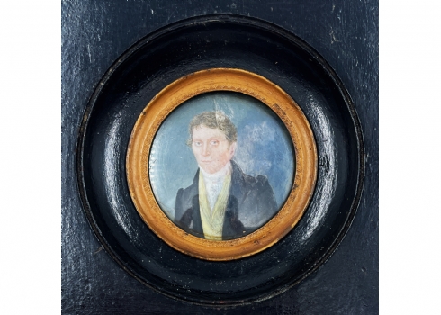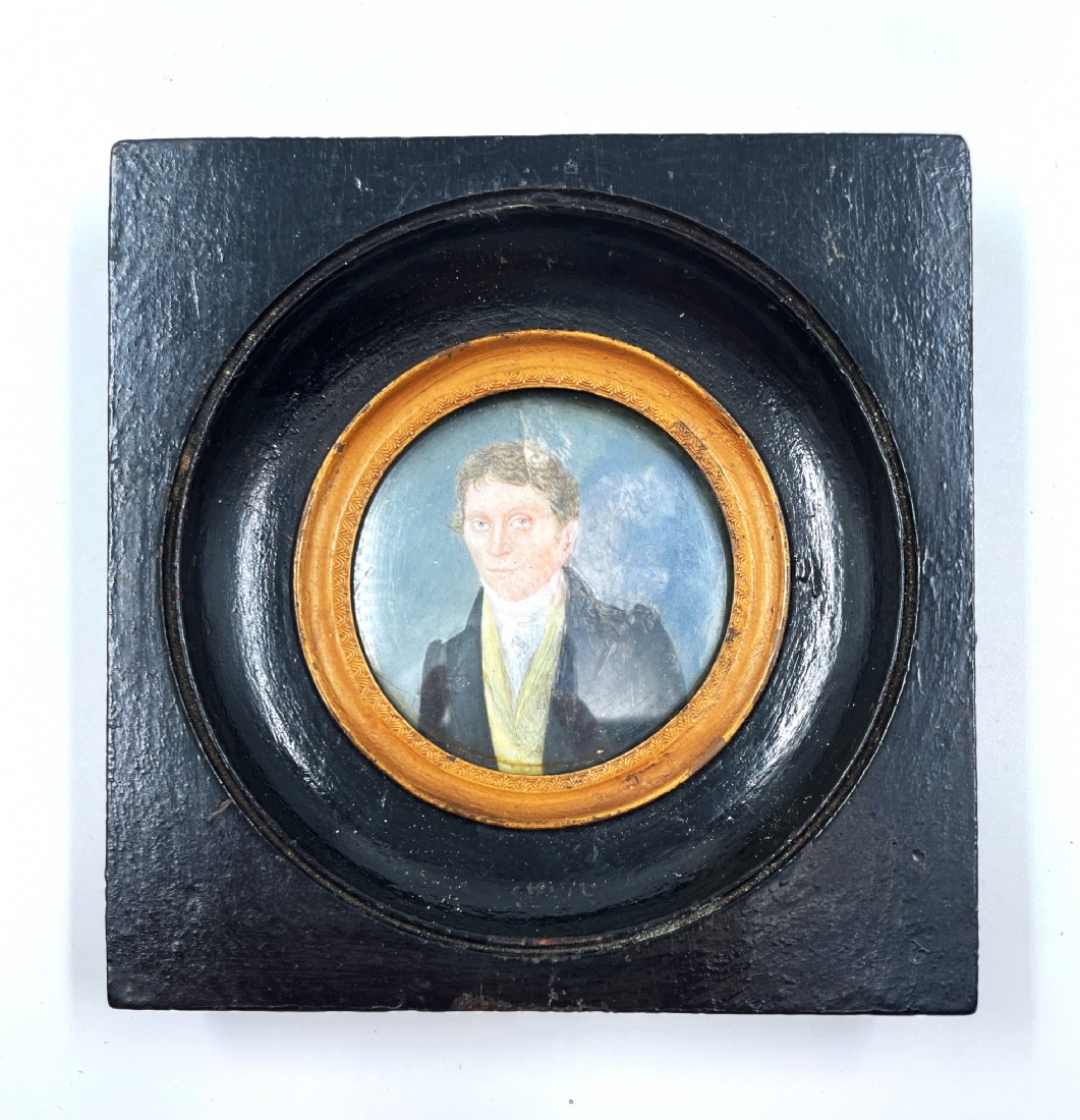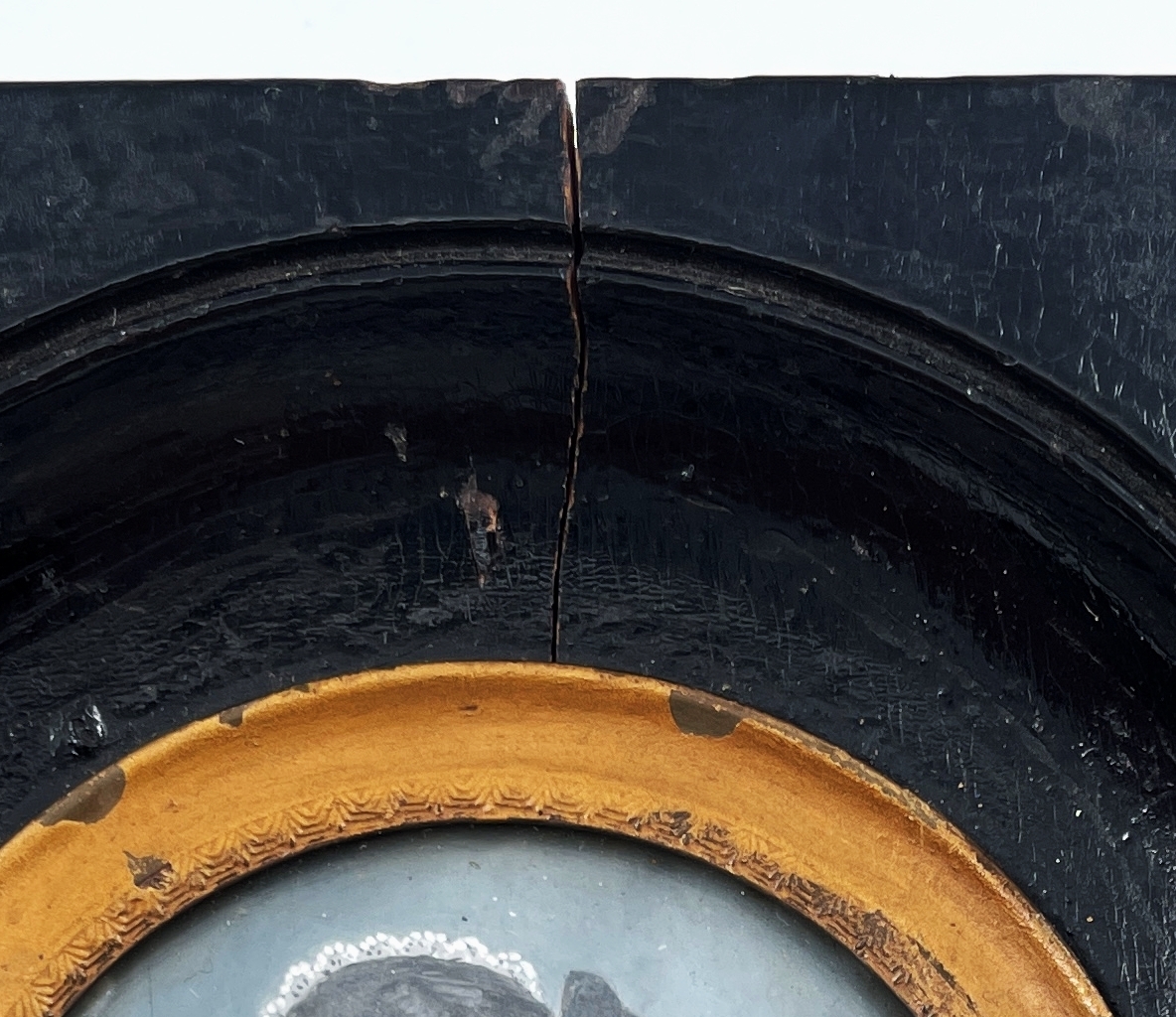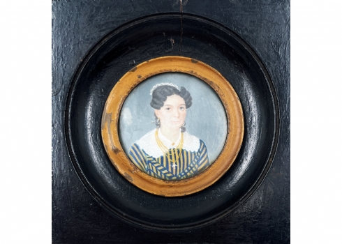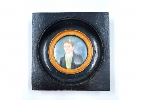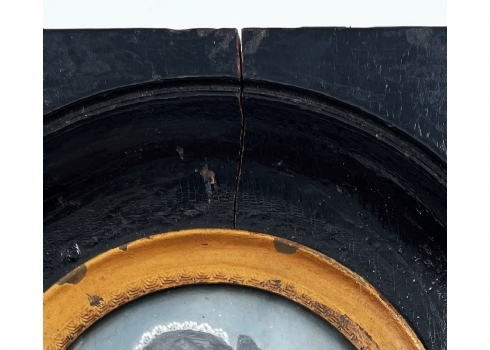 לאספני מיניאטורות עתיקות - זוג תמונות מניאטוריות מהמאה ה-19, מצויירות ביד בצבעי מים על דפי שנ-הב, מסגרות עץ שחורות (סדק קל לאחת התמונות - מצולם), קוטר כל מניאטורה: 5 ס"מ, מידות המסגרת: 11X11 ס"מ.