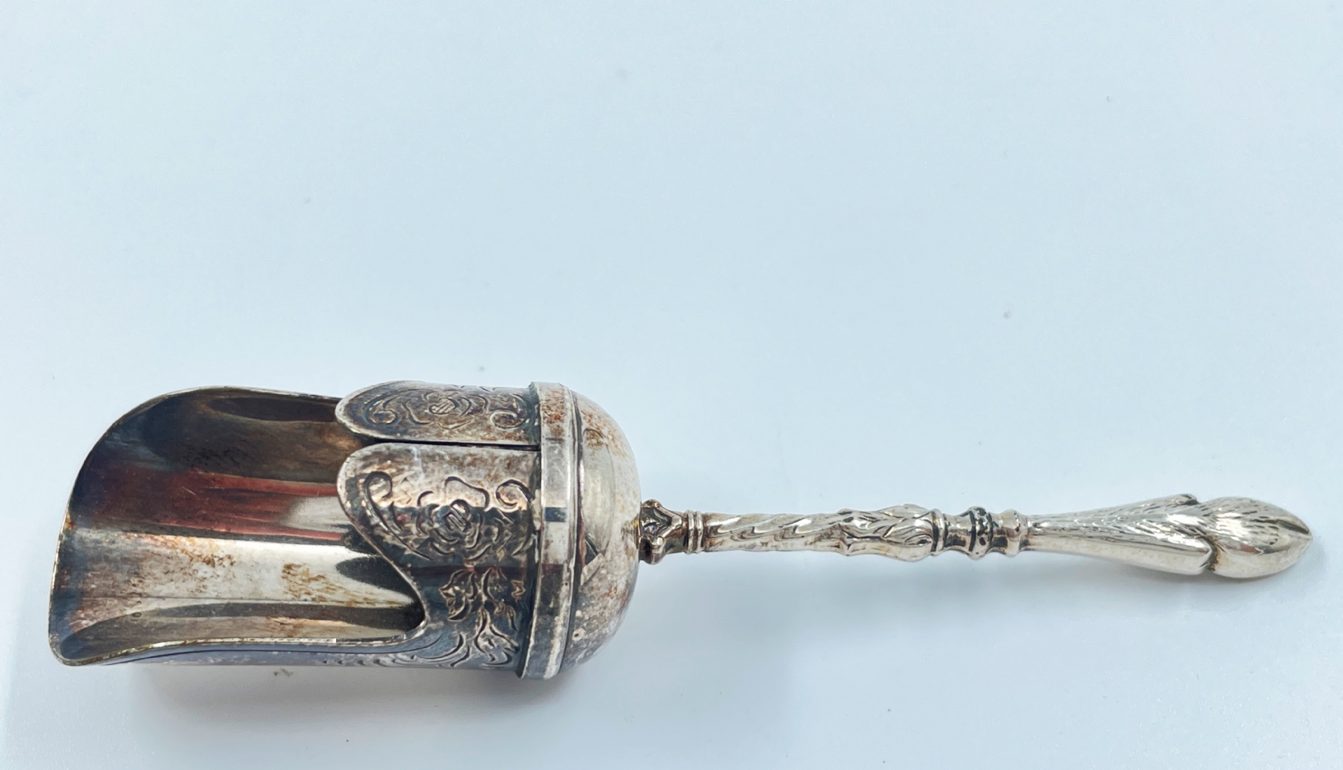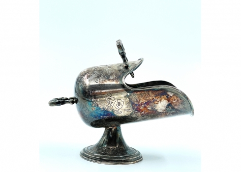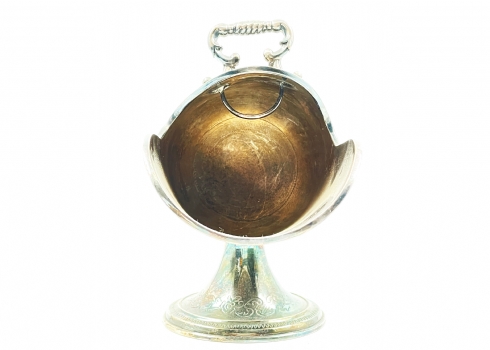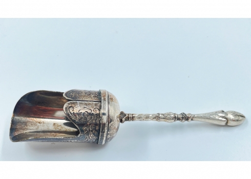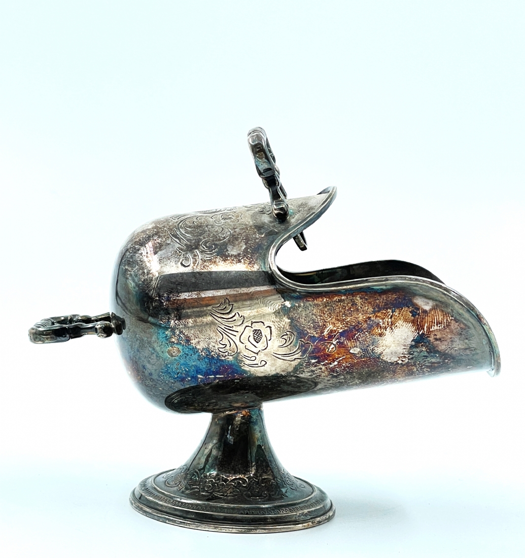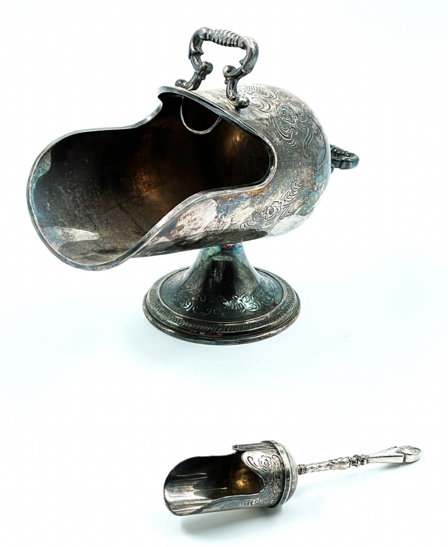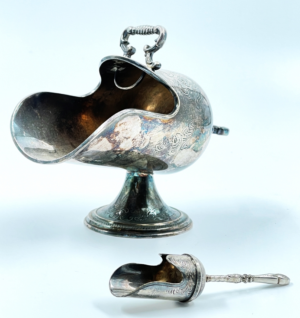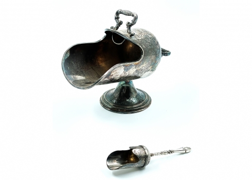כלי סוכר ישן וכפית גריפה תואמת, עשויים מתכת מצופה כסף, הכפית חתומה, גובה: 11 ס"מ, אורך: 14 ס"מ.