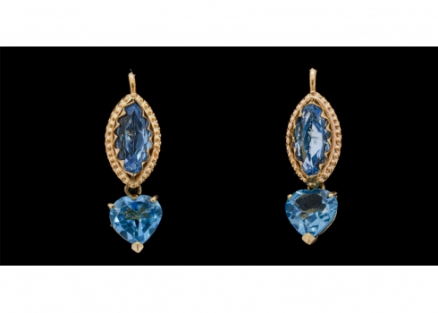 זוג עגילים עשויים זהב צהוב 18 קארט משובצים אבני טופז כחולות מלוטשות.