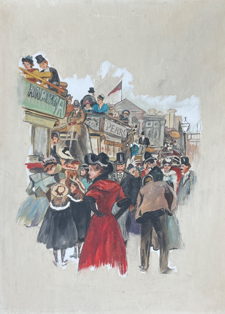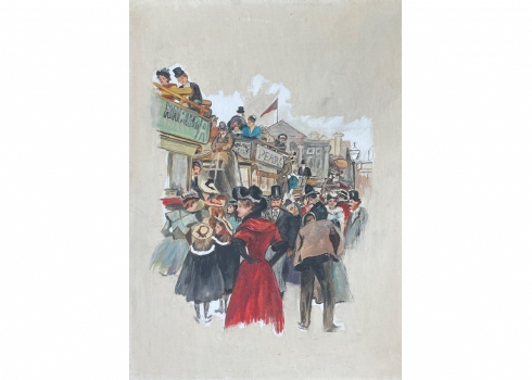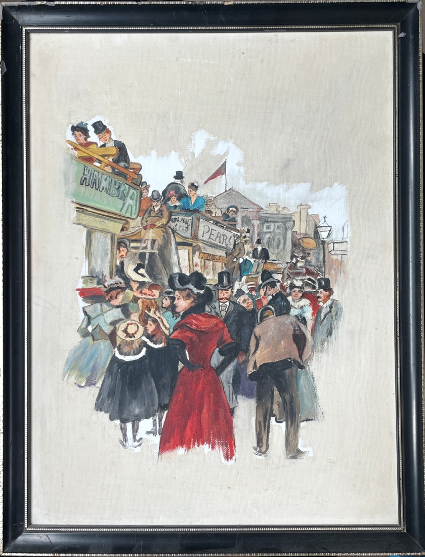 'בתור לכרכרה' - ציור ישן בסגנון עתיק, שמן על בד מוצמד ללוח, לא חתום