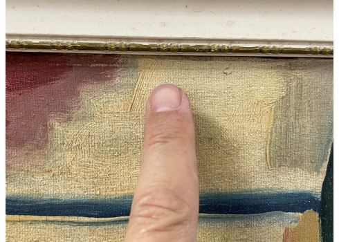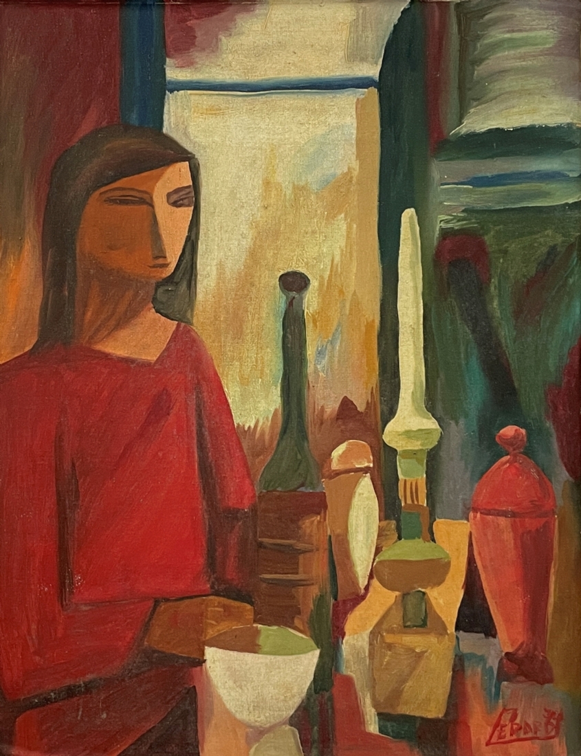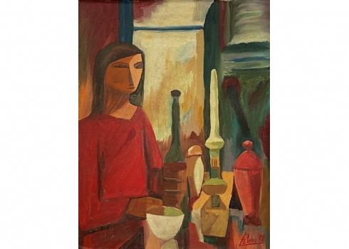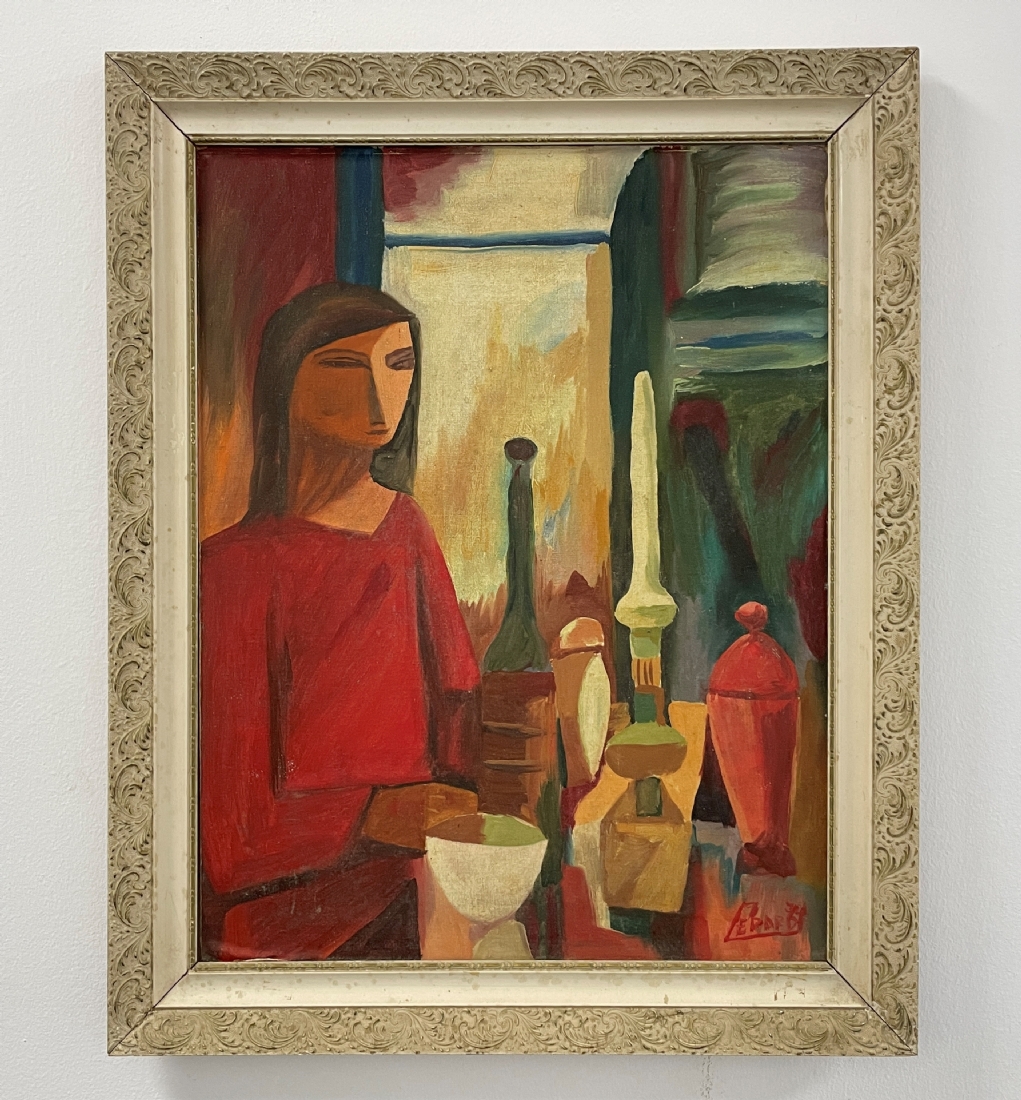 'אישה באדום יושבת במטבח' - ציור ישן, שמן על בד מוצמד ללוח, חתום ומתוארך: 1974, מידות:54X42 x ס"מ, מידות המסגרת: 64X51.5 ס"מ.