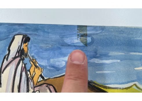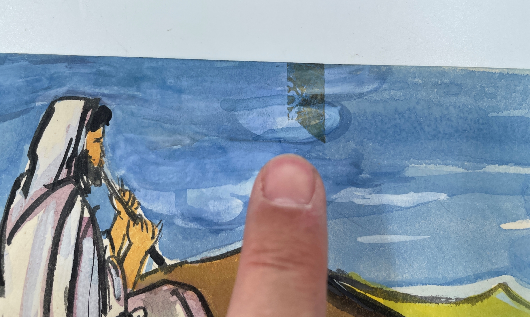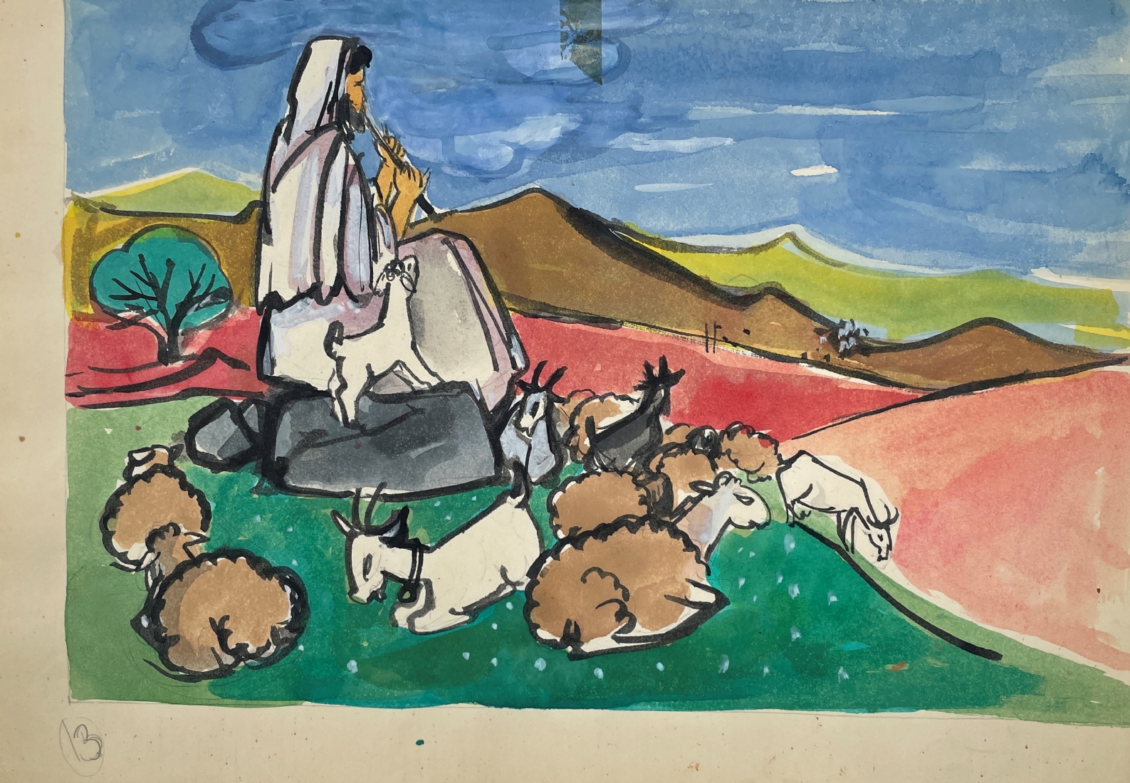 רות שלוס, (Ruth Schloss) - ציור ישן, מתוך סדרת איורים למצגות לילדים משנות ה-50 בנושא יציאת מצרים, אקוורל וגואש על נייר, לא חתום, מידות: 26X35 ס"מ. (לא ממוסגר). * מצורף להמחשה בלבד צילום שער הסדרה אליו שייך איור זה שעליו כן חתמה רות שלוס.