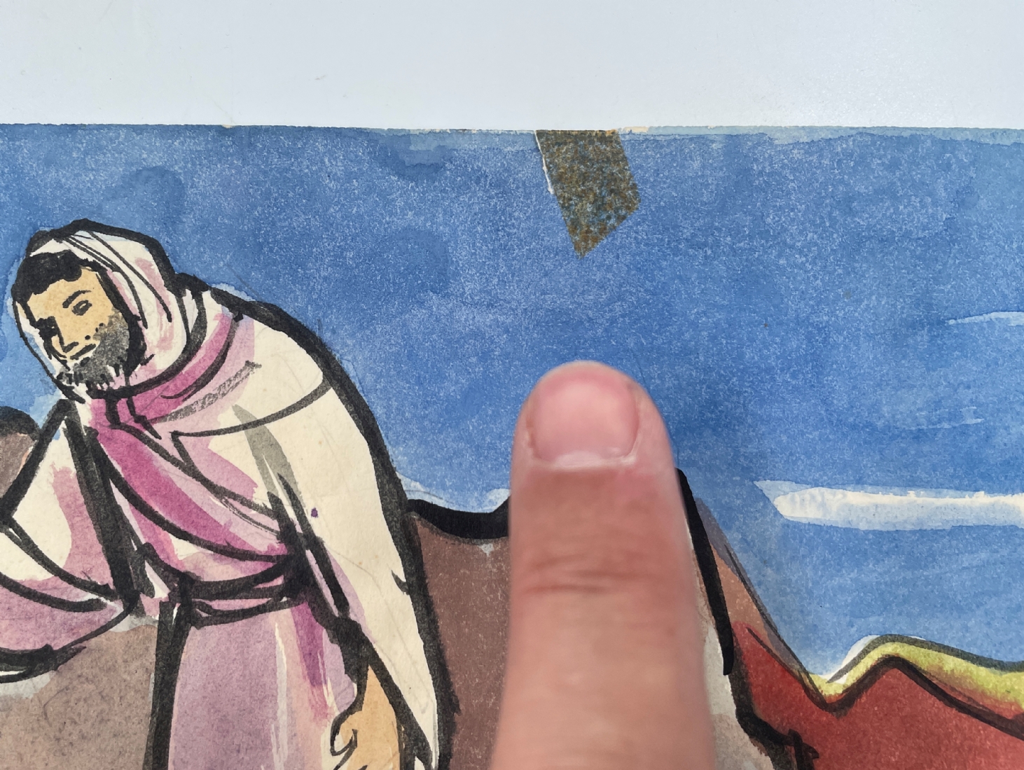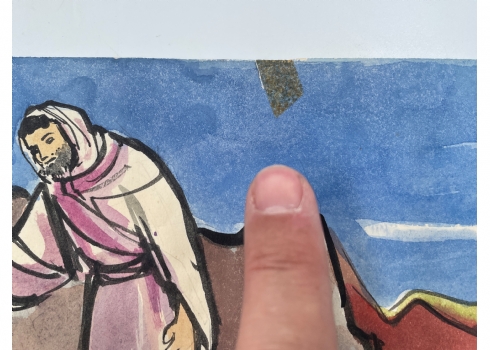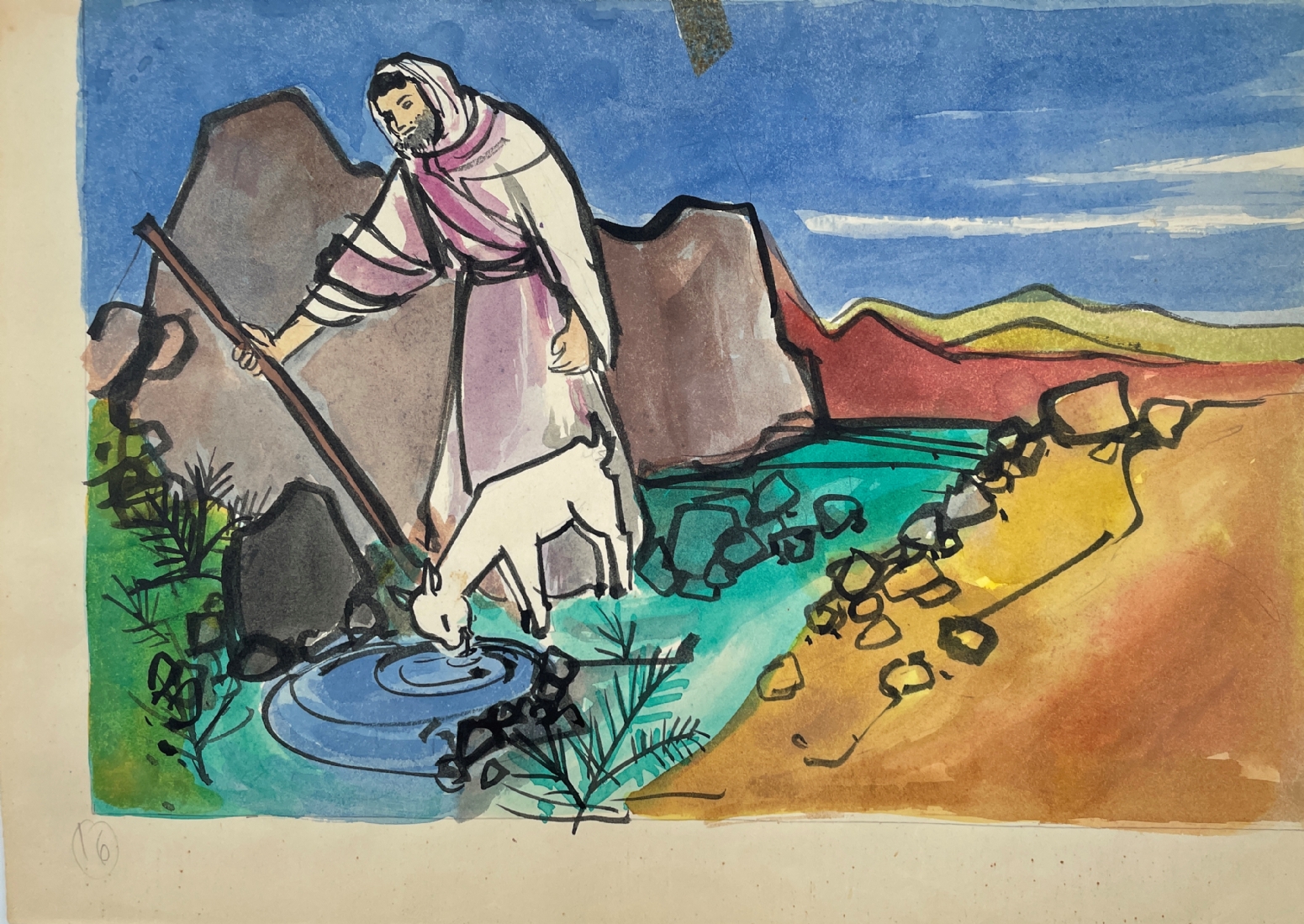 רות שלוס, (Ruth Schloss) - ציור ישן, מתוך סדרת איורים למצגות לילדים משנות ה-50 בנושא יציאת מצרים, אקוורל וגואש על נייר, לא חתום, מידות: 26X35 ס"מ. (לא ממוסגר). * מצורף להמחשה בלבד צילום שער הסדרה אליו שייך איור זה שעליו כן חתמה רות שלוס.