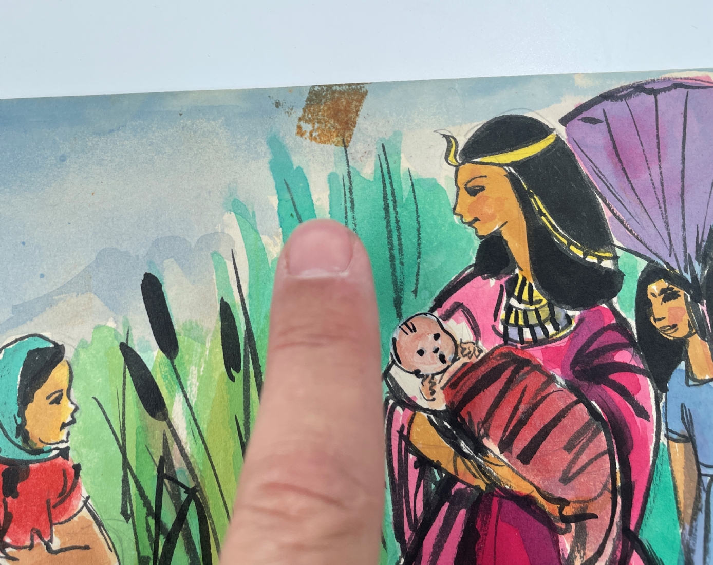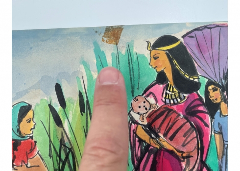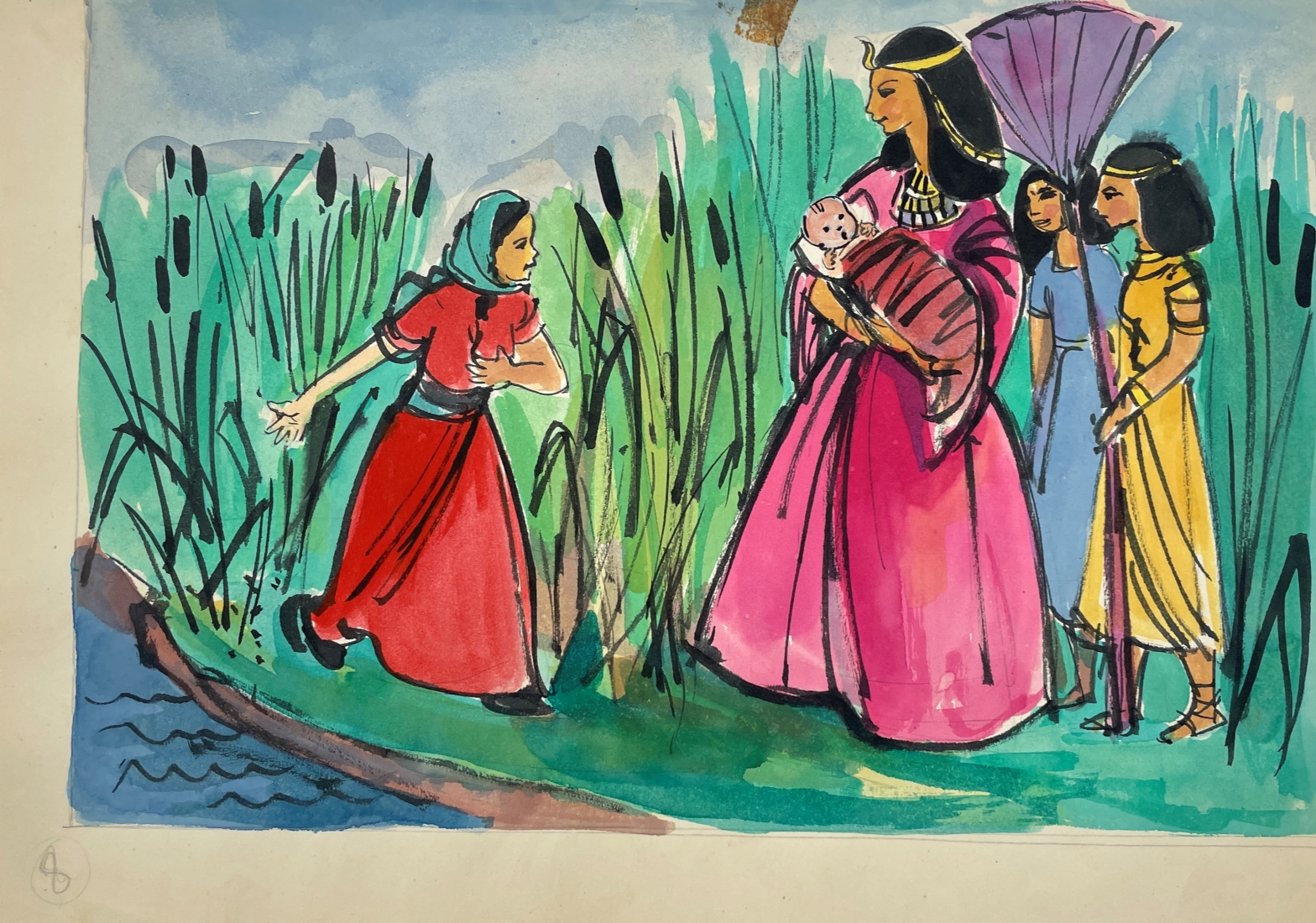 רות שלוס, (Ruth Schloss) - ציור ישן, מתוך סדרת איורים למצגות לילדים משנות ה-50 בנושא יציאת מצרים, אקוורל וגואש על נייר, לא חתום, מידות: 26X35 ס"מ. (לא ממוסגר). * מצורף להמחשה בלבד צילום שער הסדרה אליו שייך איור זה שעליו כן חתמה רות שלוס.