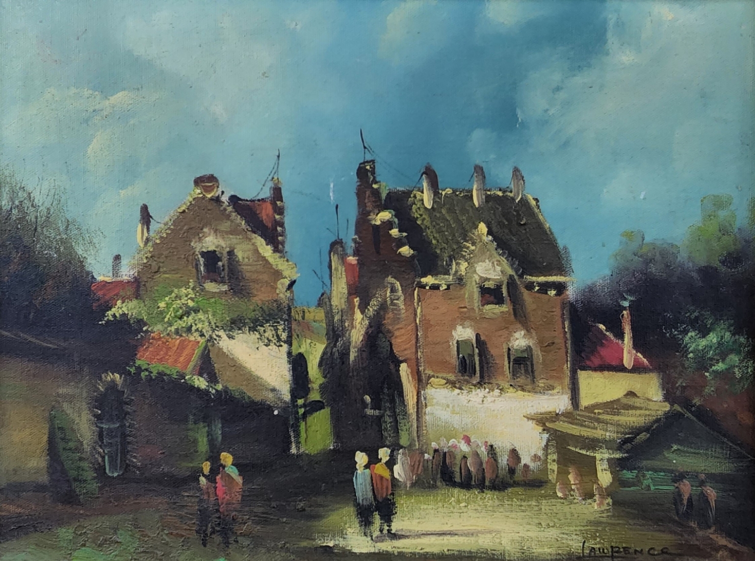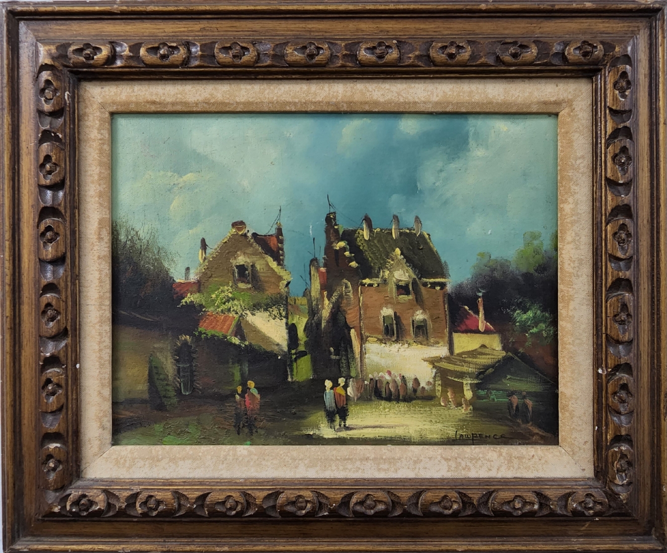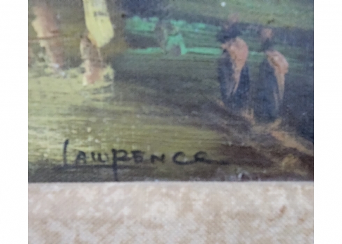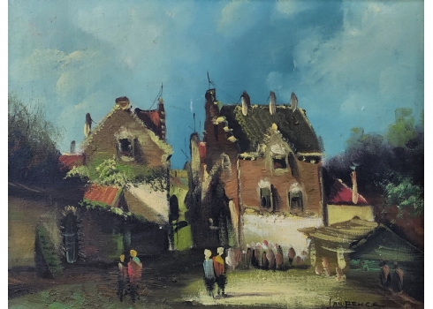 'בדרך למפגש בכפר' - ציור ישן, שמן על בד מוצמד ללוח, חתום, מידות: 30X40 ס"מ, מידות: 47X57 ס"מ.
