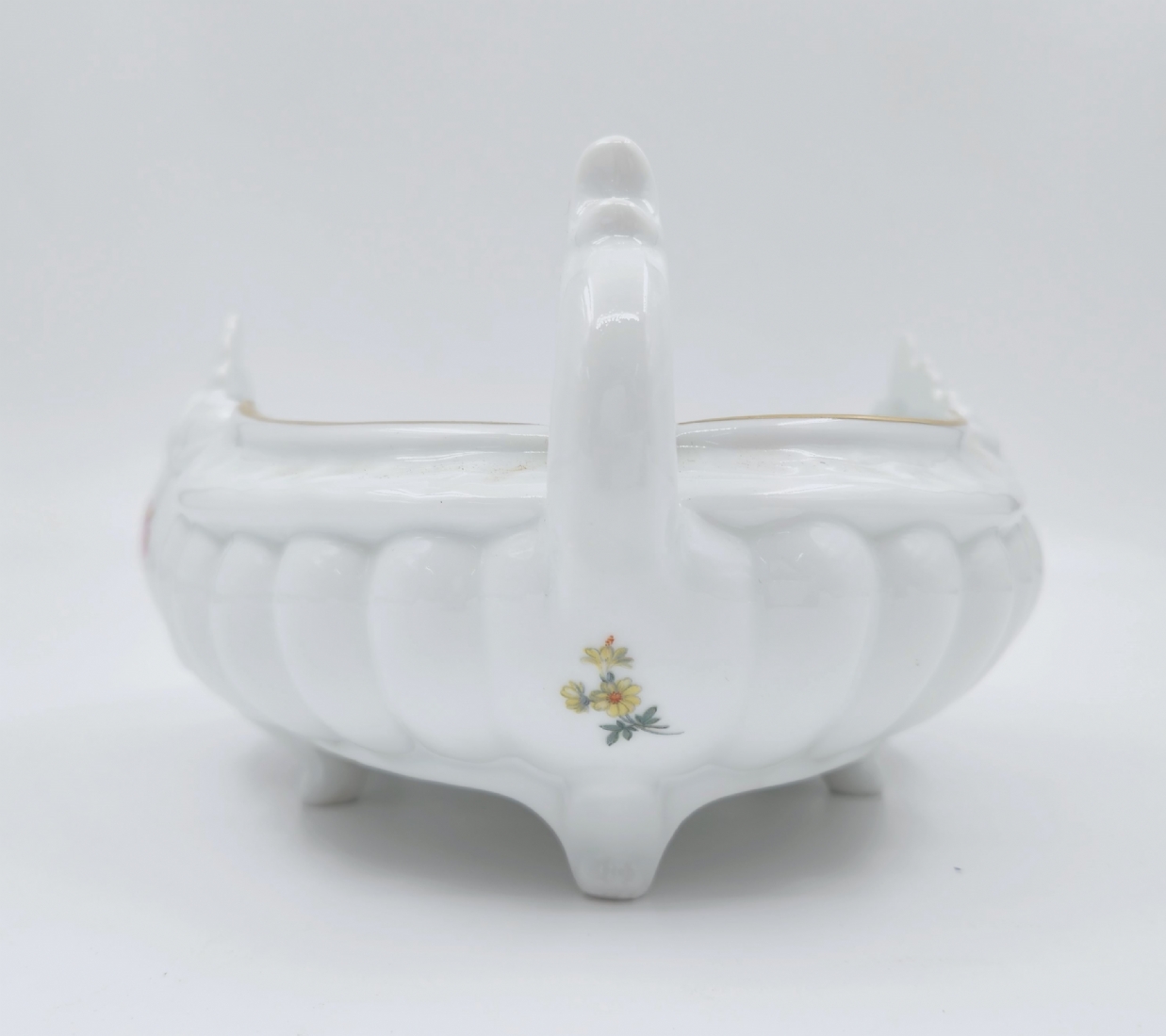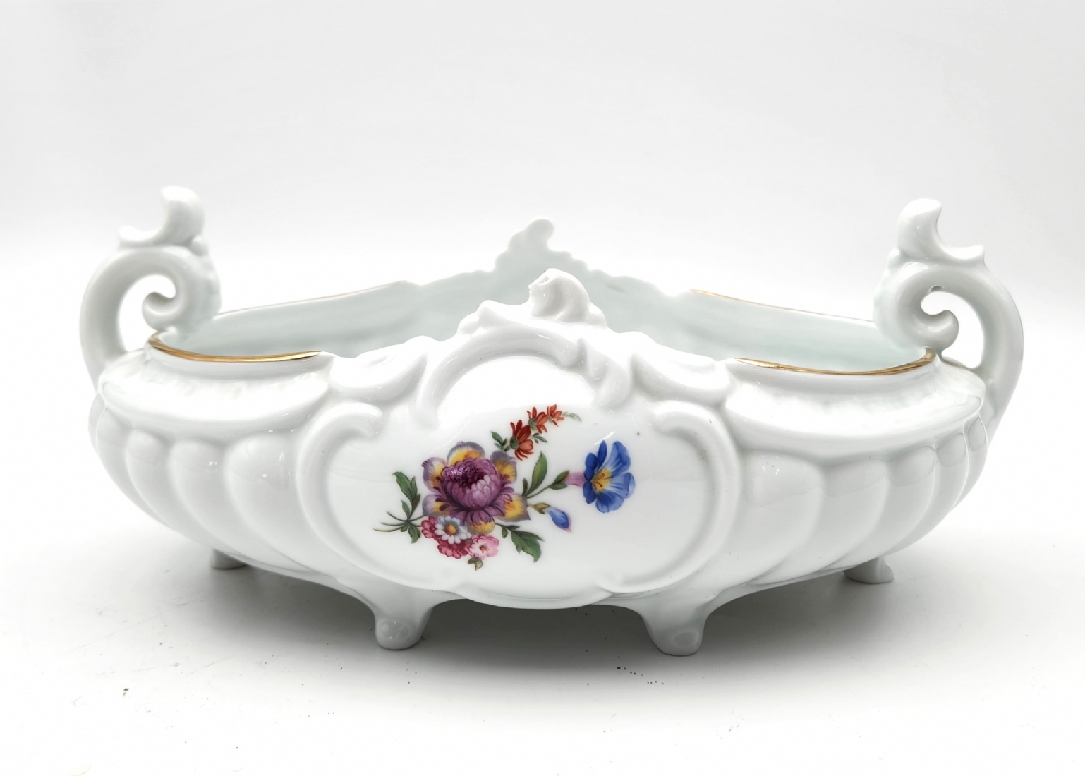 כלי פורצלן גרמני בווארי ישן ויפה, מעוטר וחתום, פגם קטן לקצה השפה, גובה כולל ידיות: 12 ס"מ, אורך: 28 ס"מ.