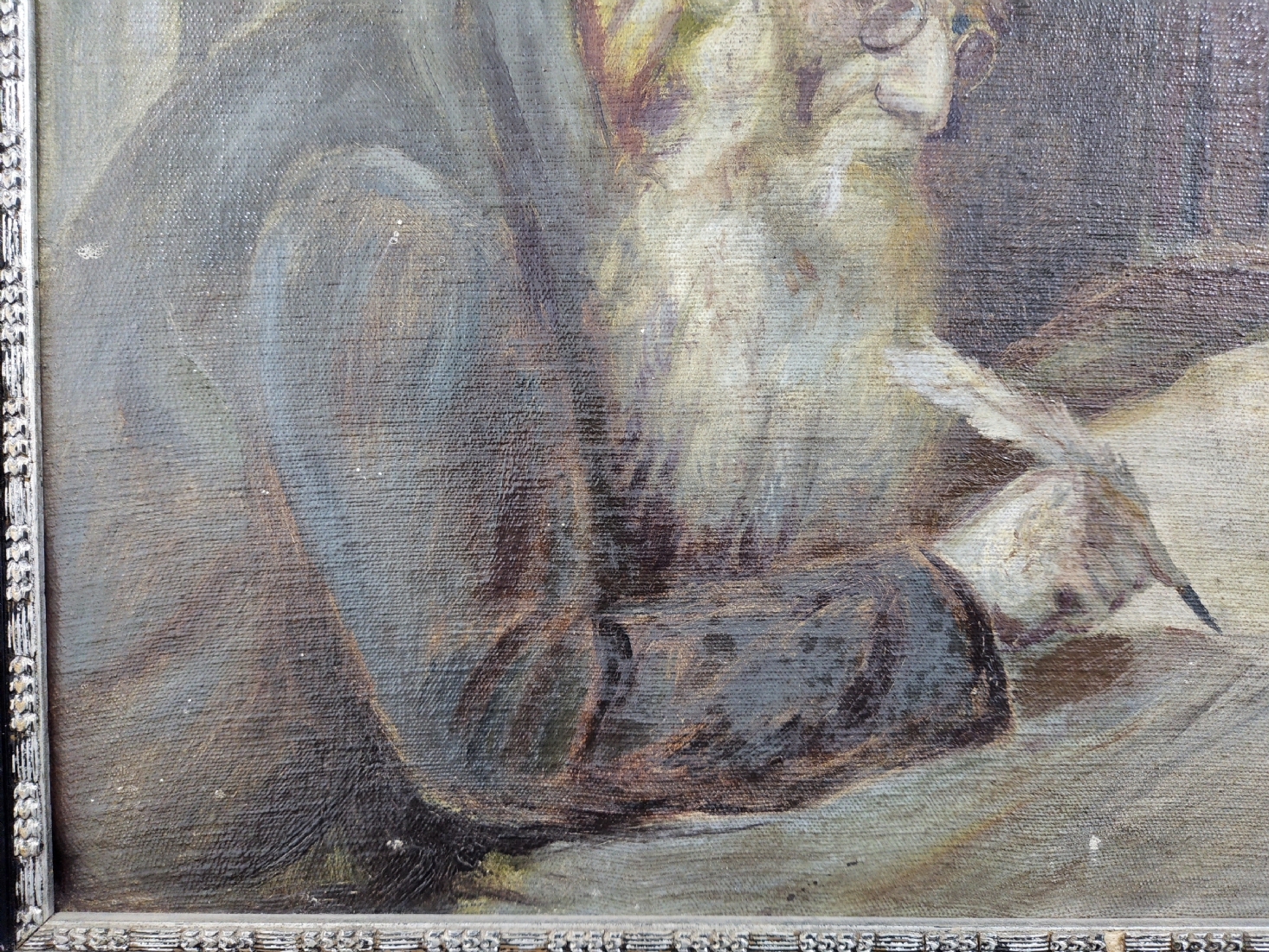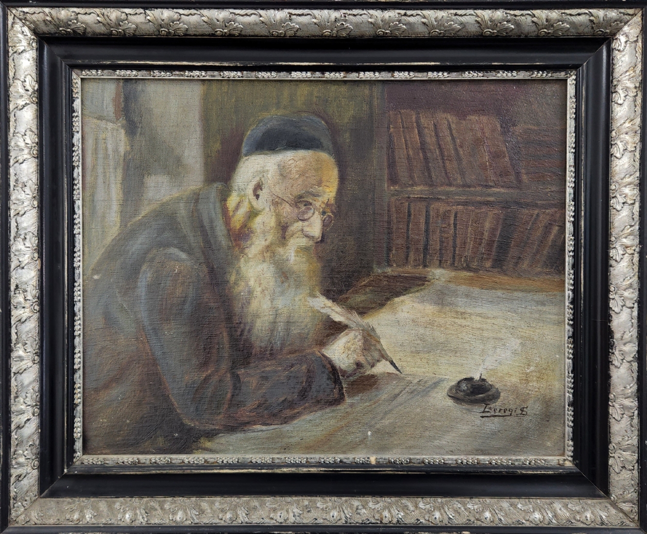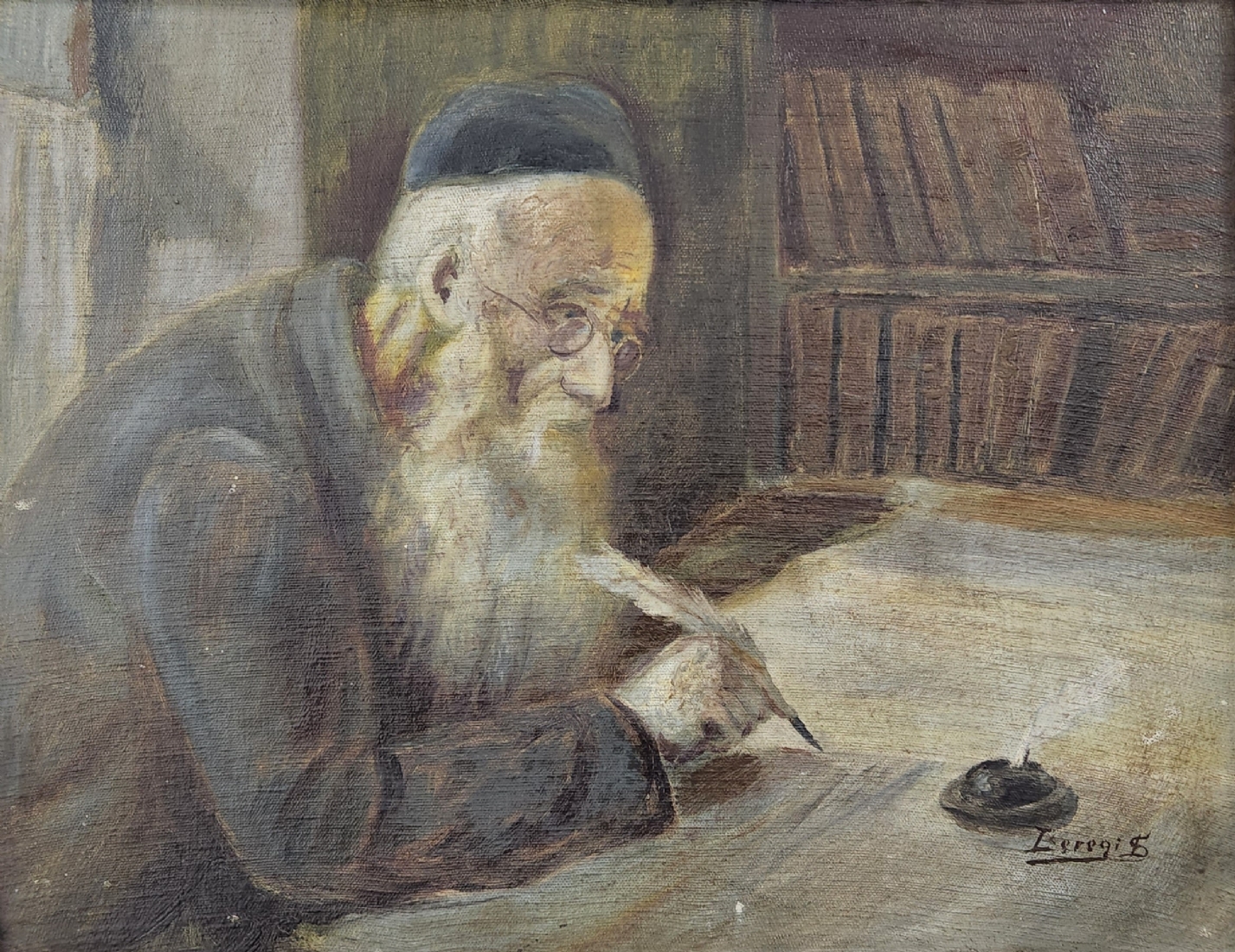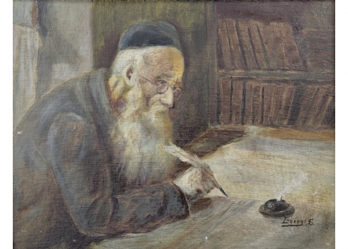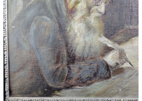 'סופר סת"ם' - ציור ישן, שמן על בד מוצמד ללוח, חתום, אמן לא מזוהה