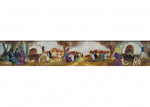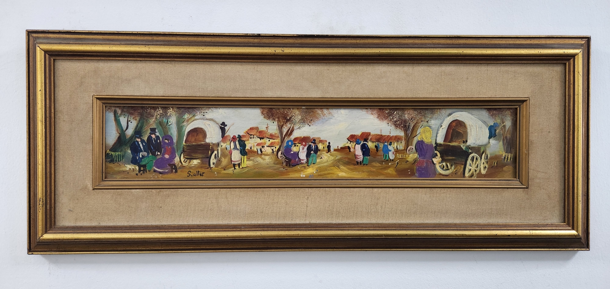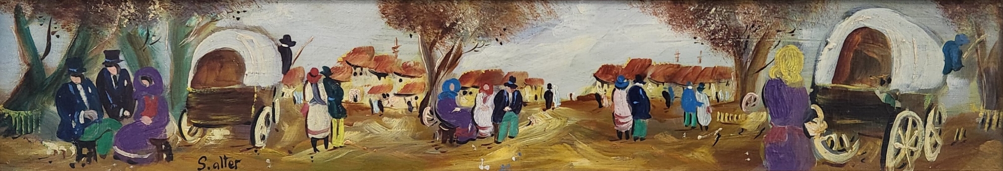 שלמה אלטר (Shlomo Alter) - 'כרכרות בכפר' - ציור ישן ויפה, שמן על בד צרפתי, חתום, מידות הציור: 11X60 ס"מ.