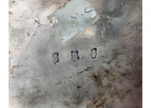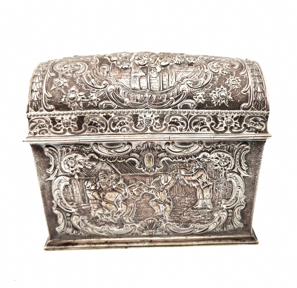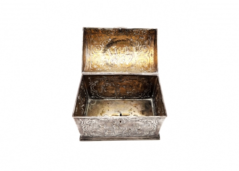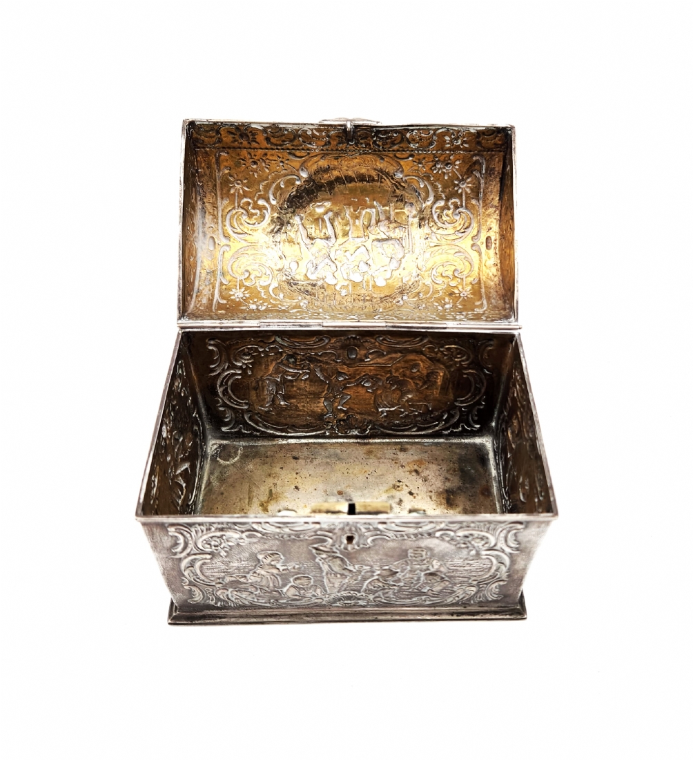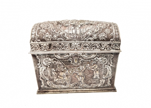 תיבת כסף גרמנית לחתונה (נקראת גם: Bridal chest או bunker chest), עשויה כסף '800', חותמות, יוצרה בעיר הנאו (Hanau), מעוטרת עיטורי בלט בעבודת רפוסה (Repousse) בסגנון הניאו רוקוקו, משקל: 537 גרם, סוף המאה ה-19 או תחילת המאה העשרים, גובה: 12.5 ס"מ, מידות הבסיס: 9.5X15 ס"מ.