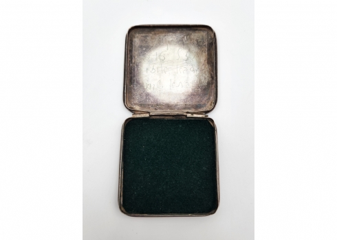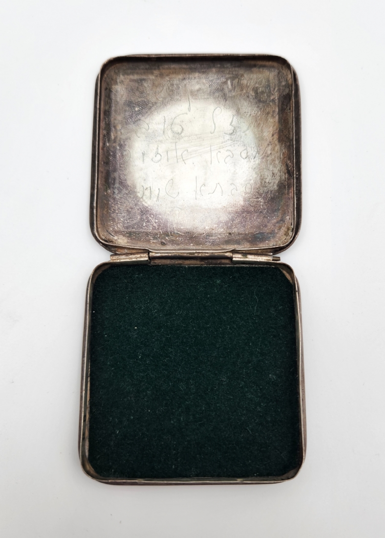 לאספני ישראליאנה של שנות החמישים - פודרייה ישראלית ישנה עשויה כסף '833', חתומה, מעוטרת במפת ישראל בחריטת יד, חתומה, משקל כולל: 37 גרם, רוחב: 6.5 ס"מ.