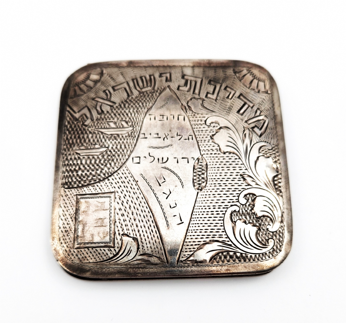 פודרייה ישראלית ישנה עשויה כסף '833', חתומה, מעוטרת במפת ישראל בחריטת יד, חתומה