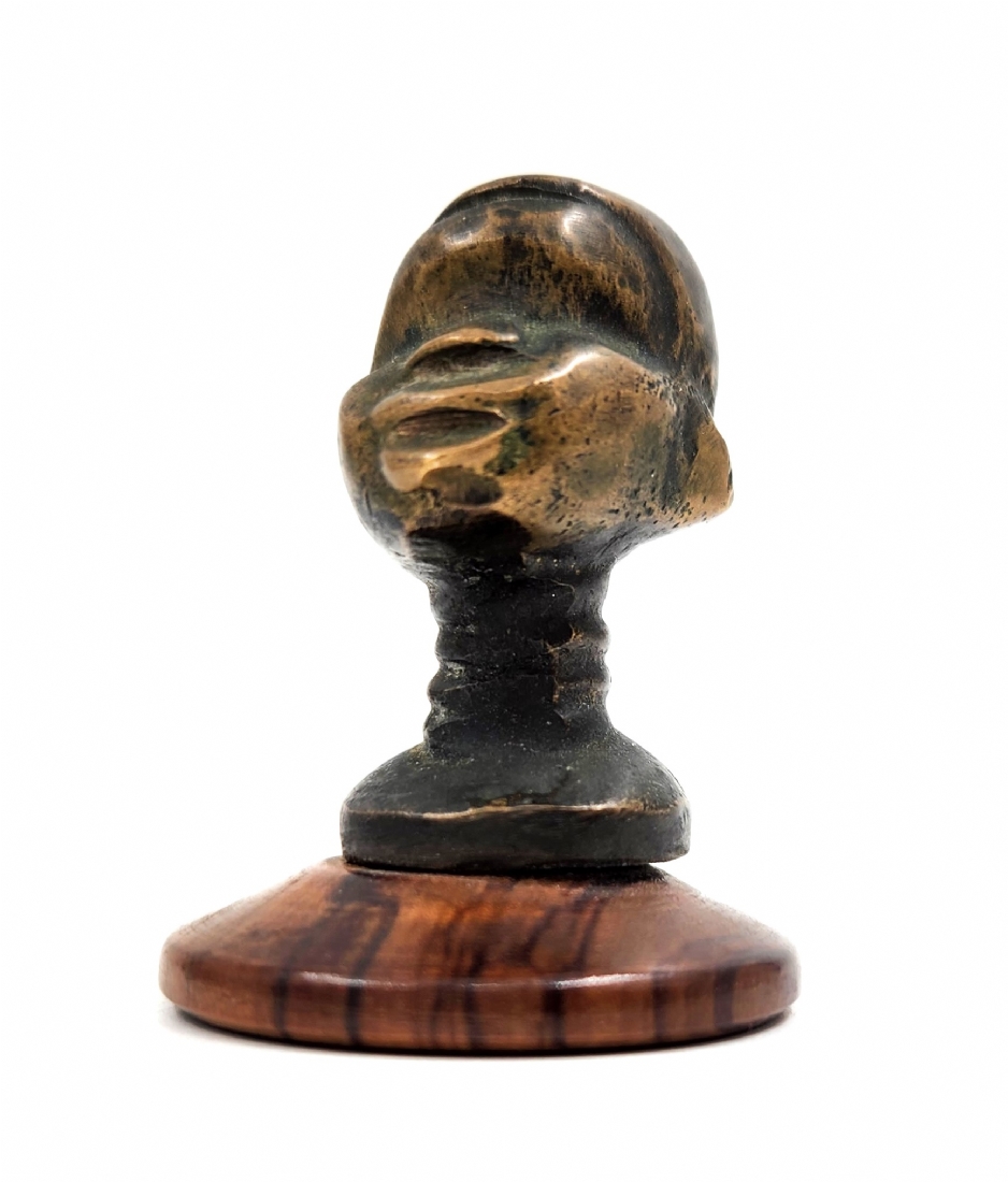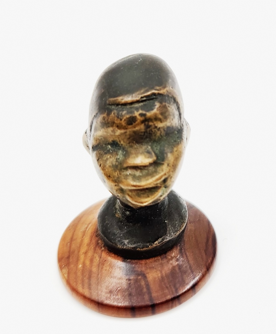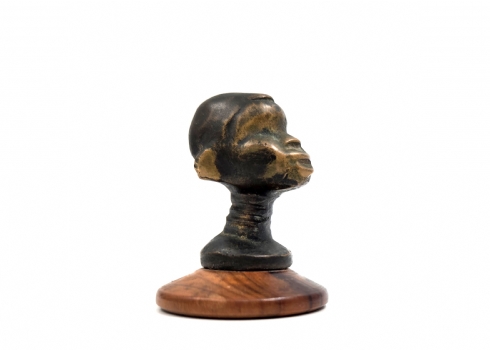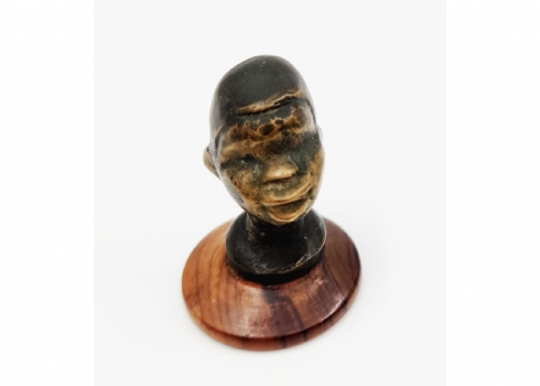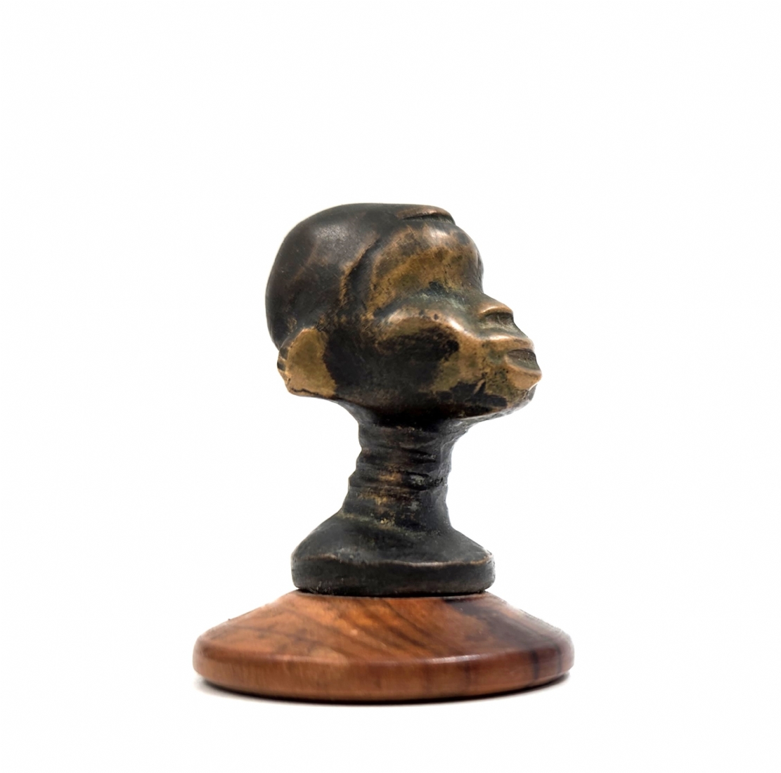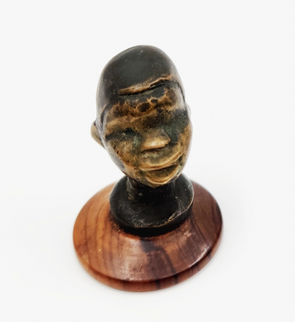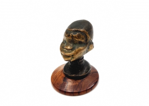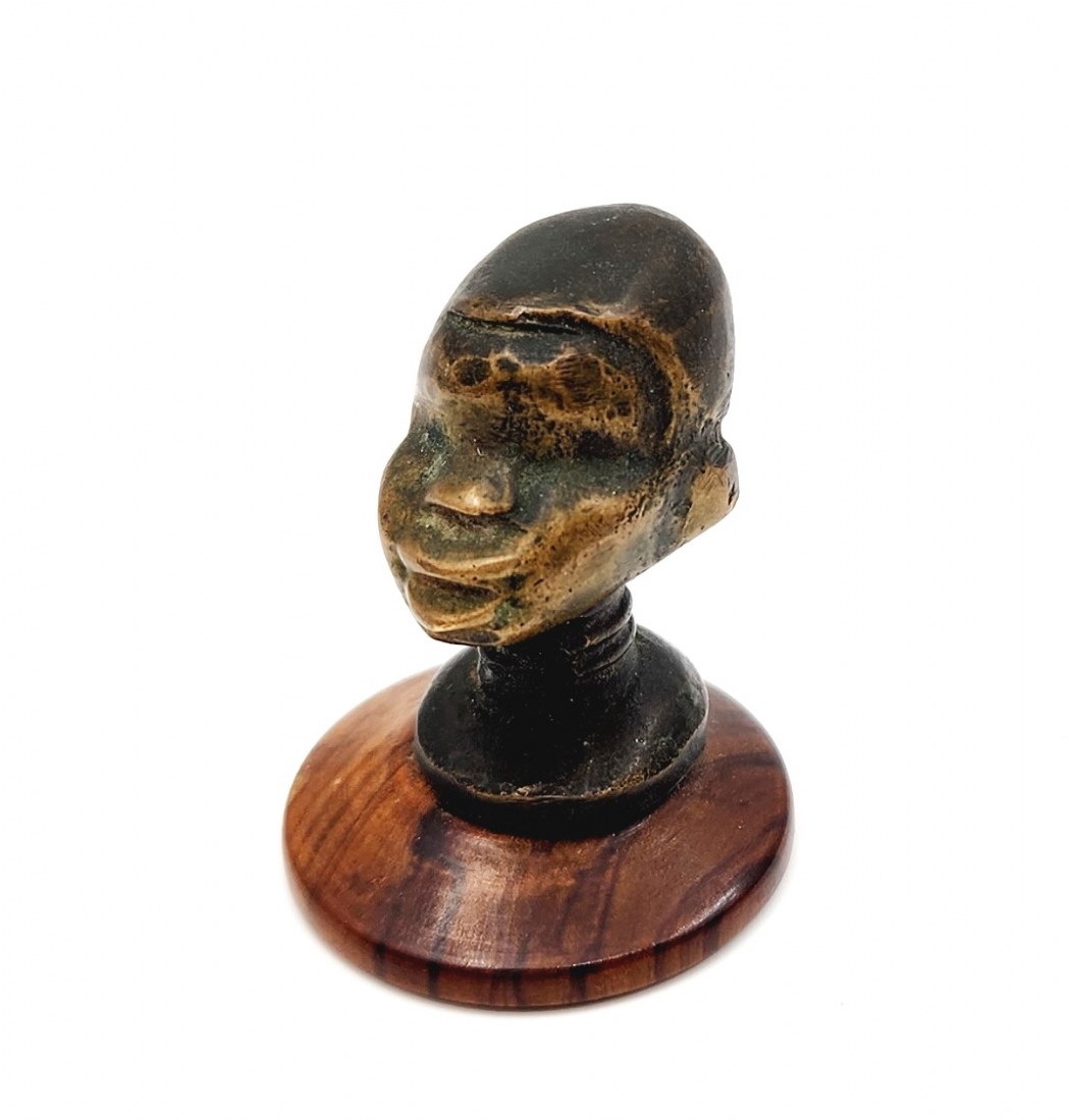 לאספני אר דקו ולאספני מיניאטורות - פסלון מיניאטורי איכותי ויפה בדמות ראש אישה אפריקאית, תקופת סגנון האר דקו, 1920-1935 בקירוב, עשוי ברונזה ובסיס עץ זית, גובה כולל: 5 ס"מ.