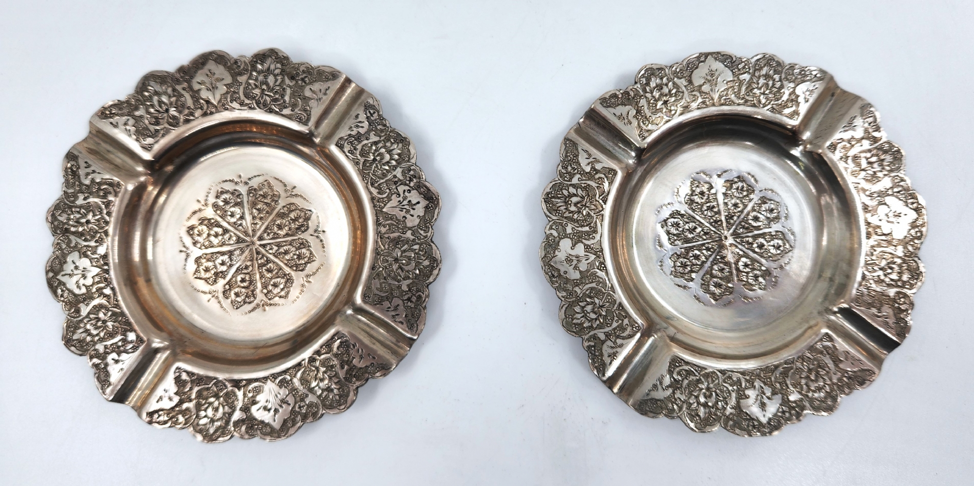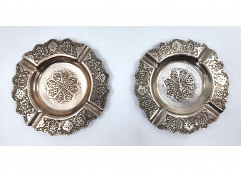 זוג מאפרות כסף פרסיות יפות במיוחד, מעוטרות וחתומות, עשויות כסף '840', משקל כולל: 142 גרם, קוטר: 11 ס"מ.