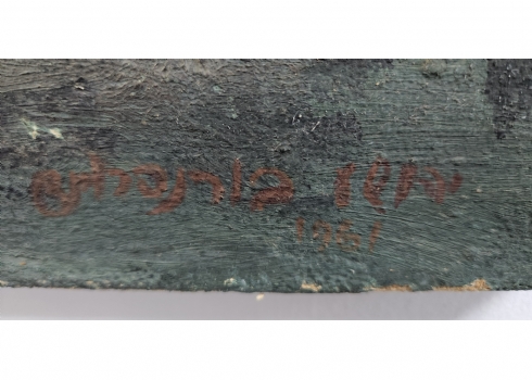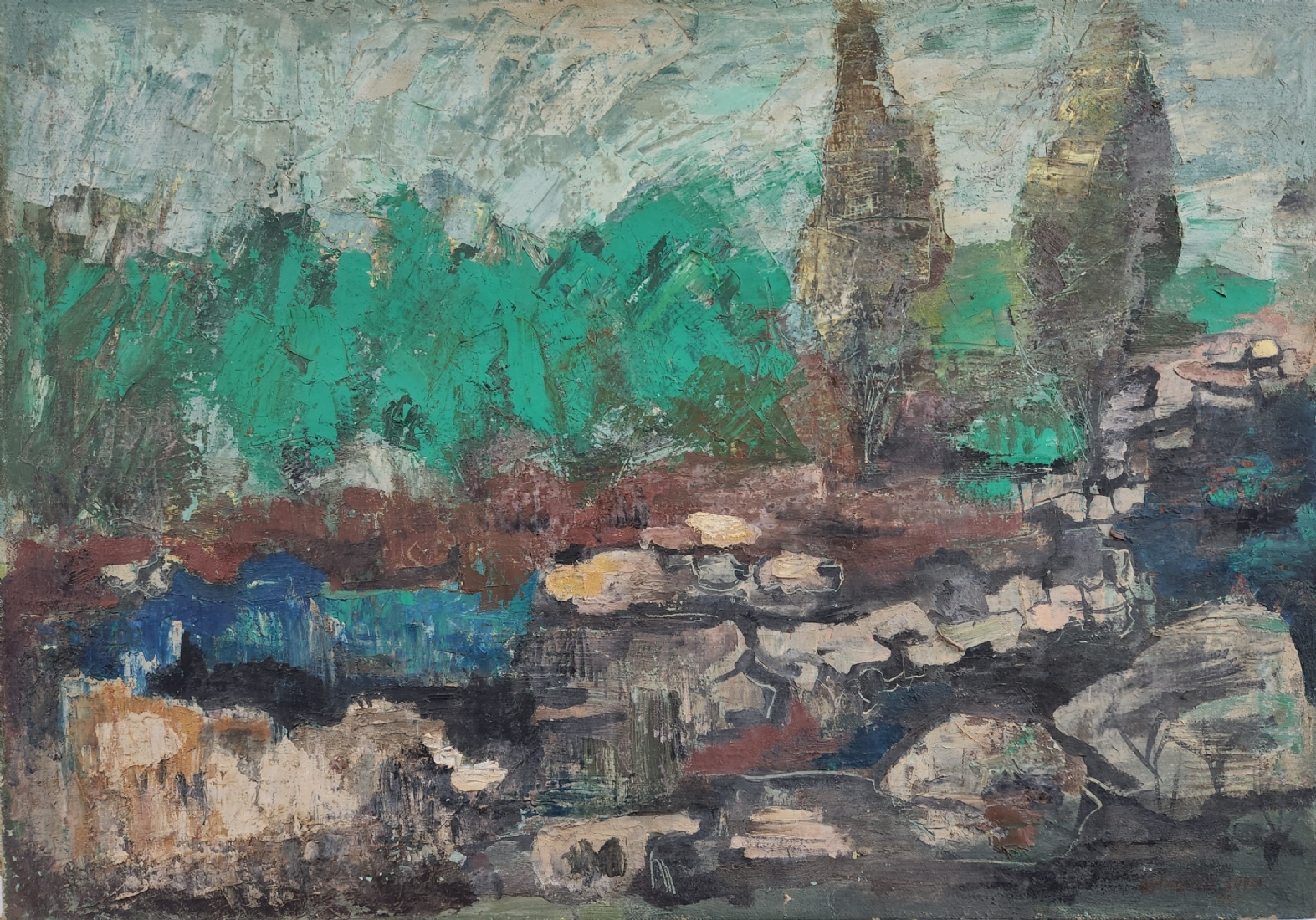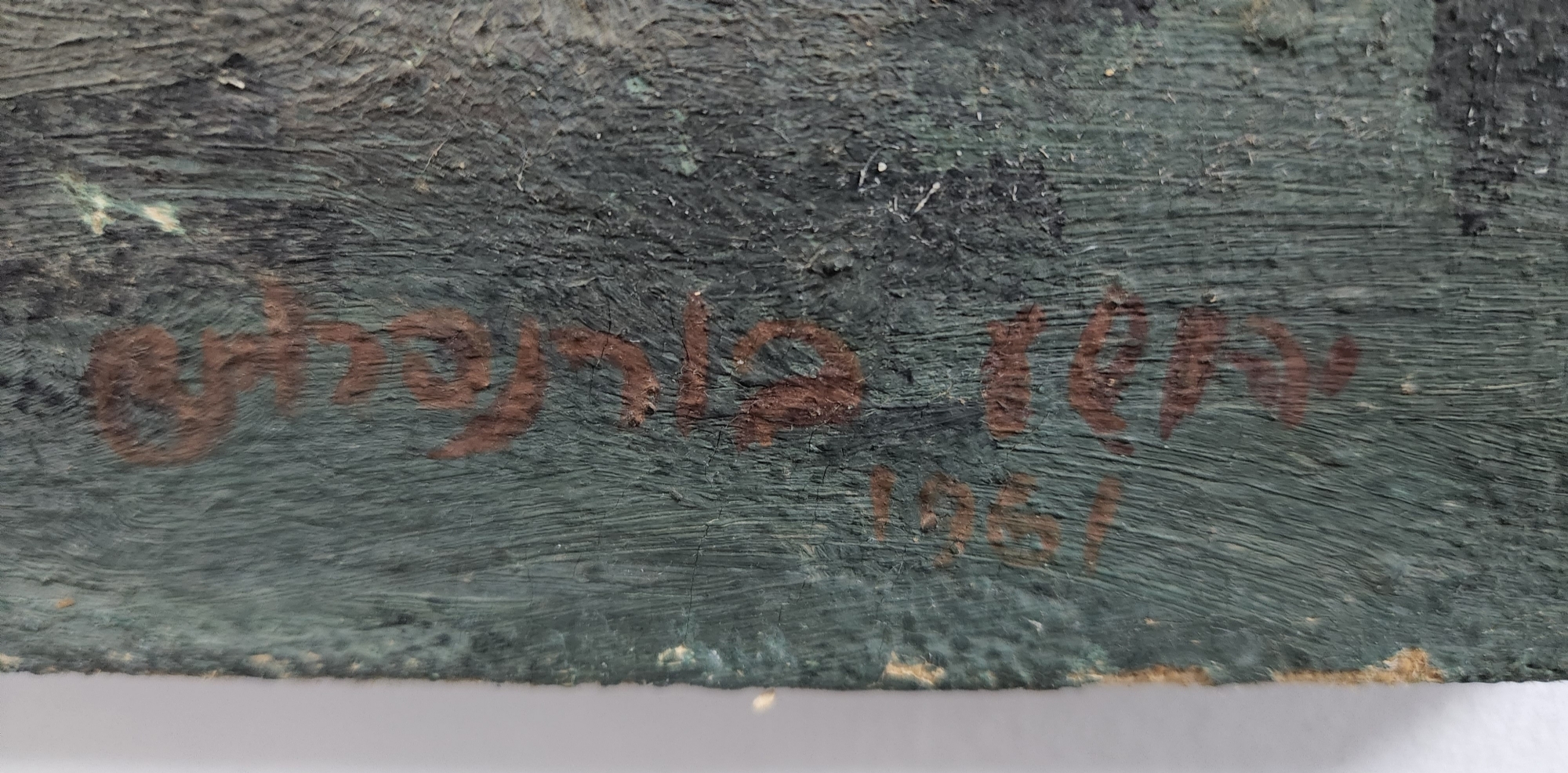 יהושע בורנפרוינד - 'זוג ברושים בנוף סלעי' - ציור גדול ויפה במיוחד של האמן, שמן על בד, חתום ומתוארך: 1961, מידות: 65X92 ס"מ.