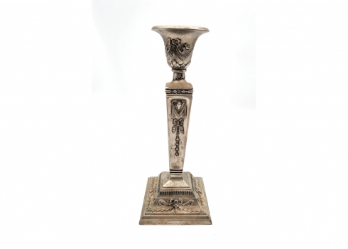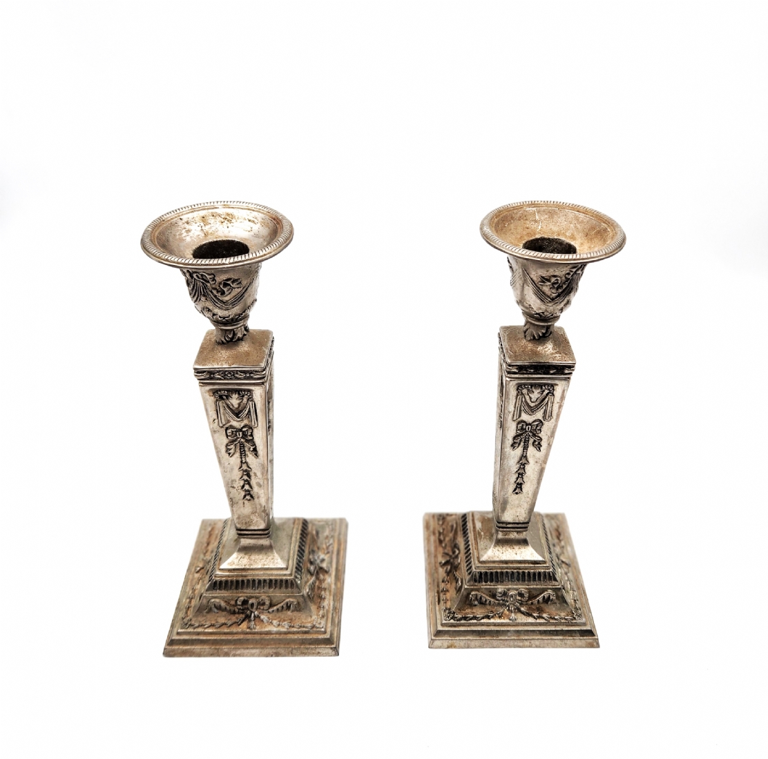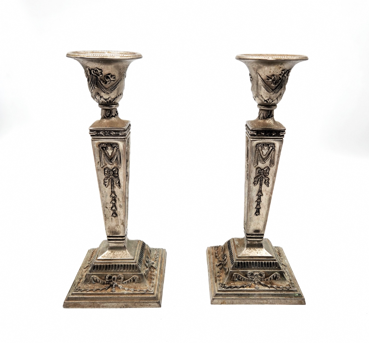 זוג פמוטים ישנים בסגנון ניאו קלאסי עשויים מתכת מצופים כסף, גובה: 24.5 ס"מ.