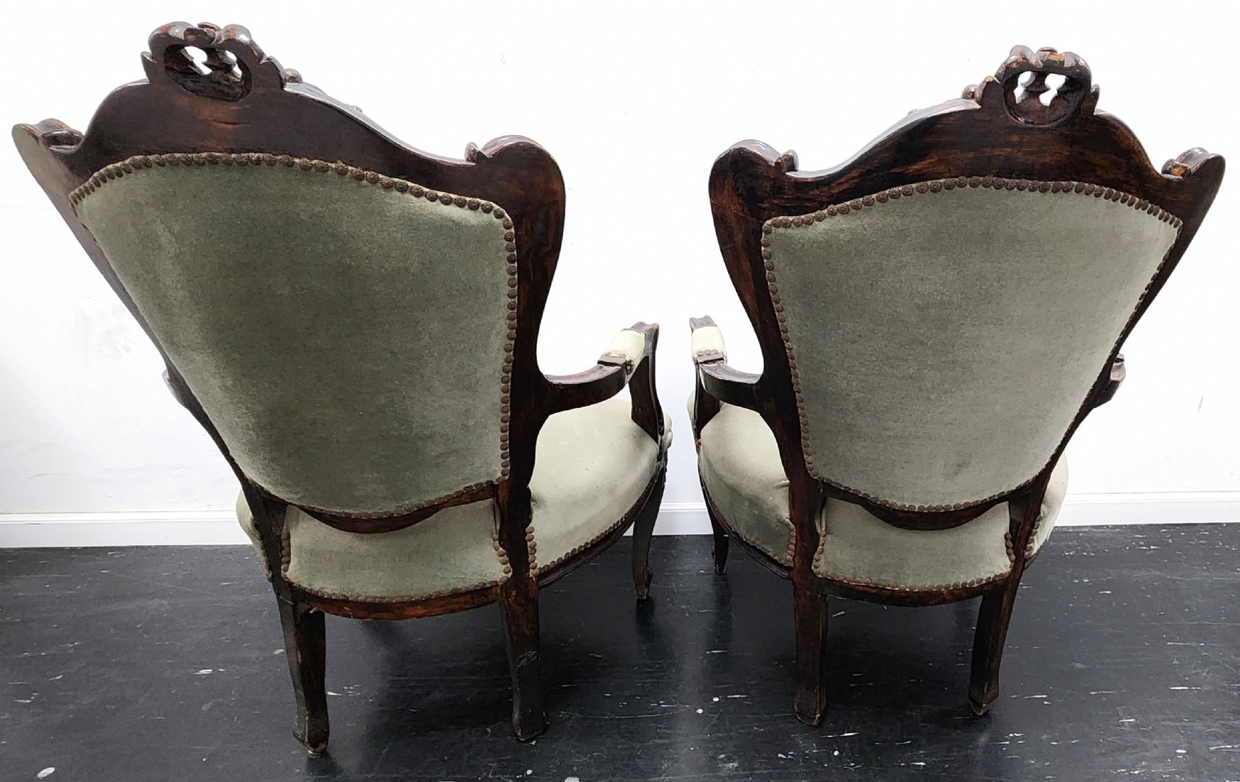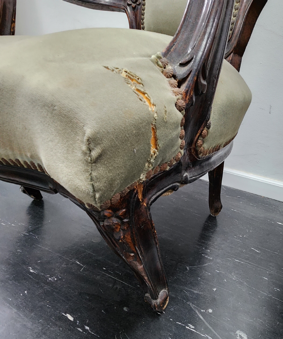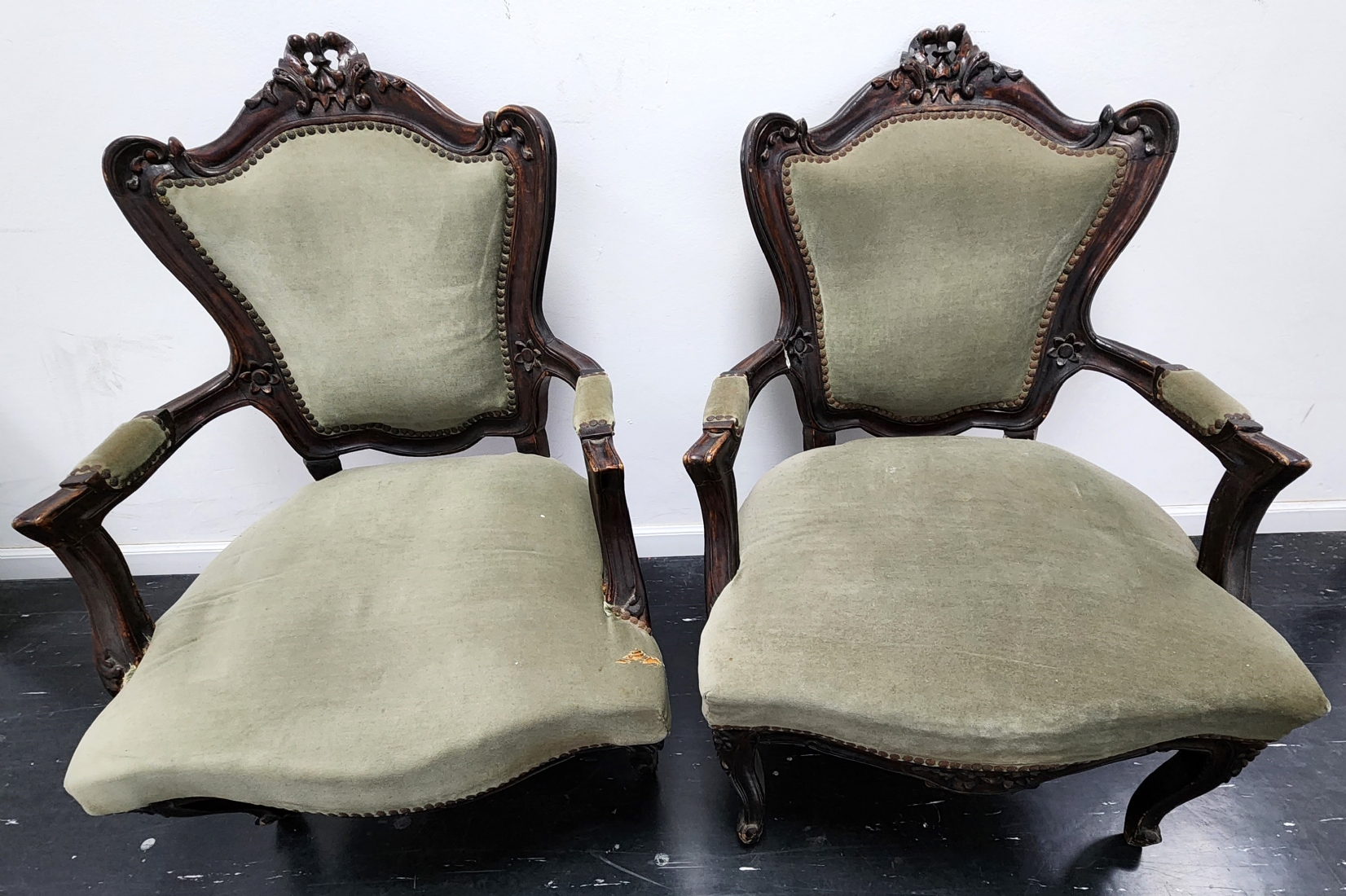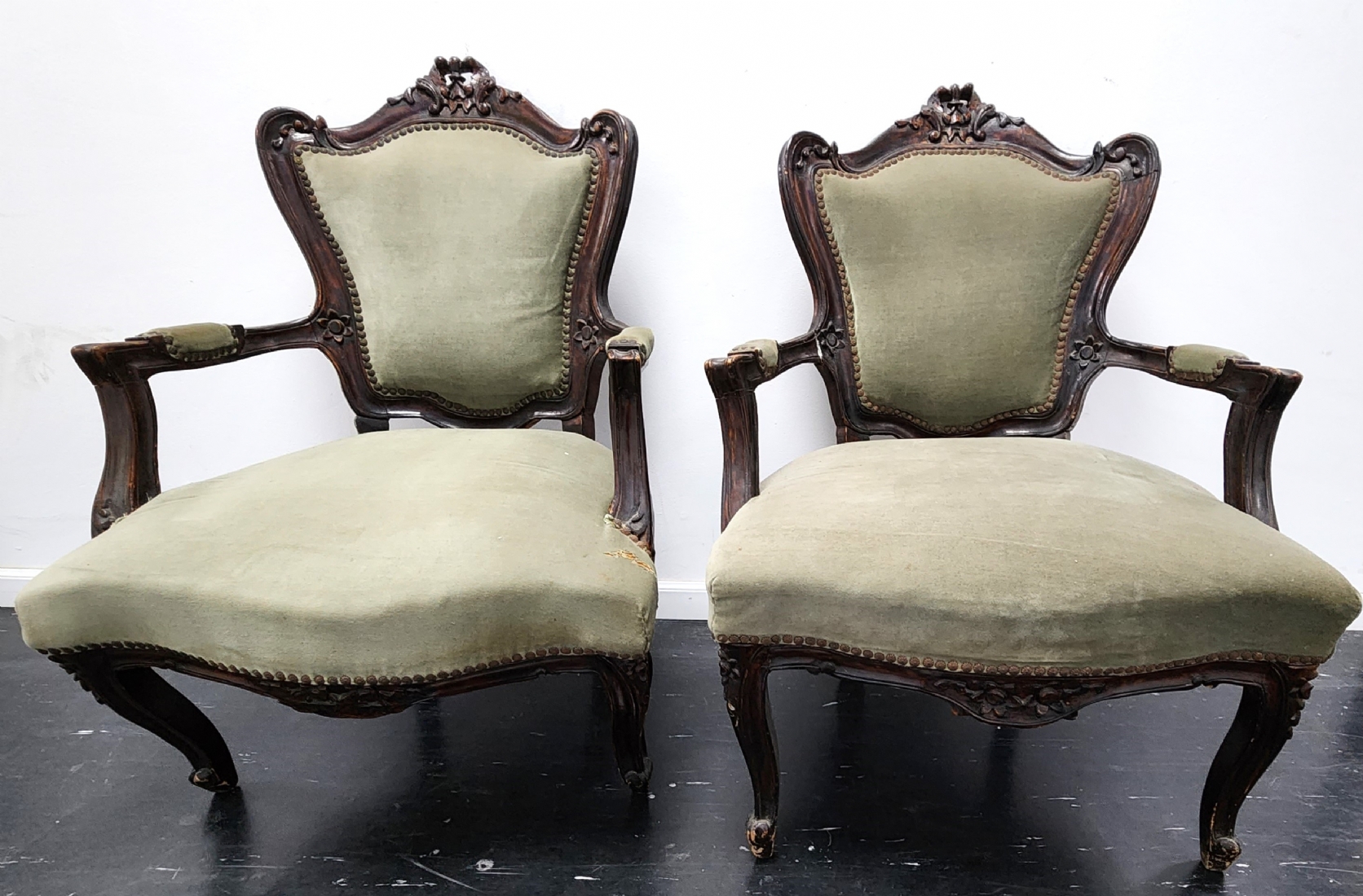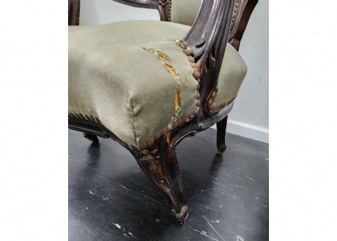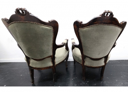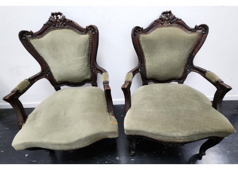 זוג כורסאות עתיקות ויפות עשויות עץ מגולף וריפוד בד בגוון אפור כחלחל/ירקרק, מצב בהתאם לגיל ופגמים רבים: תיקון למשענת היד, שתי משענות יד מתפרקות, משענת יד אחת זקוקה להידוק, ו2 רגליים שבורות וזקוקות לתיקון, בגובה: 99 ס"מ, רוחב: 68 ס"מ, עומק: 53 ס"מ.