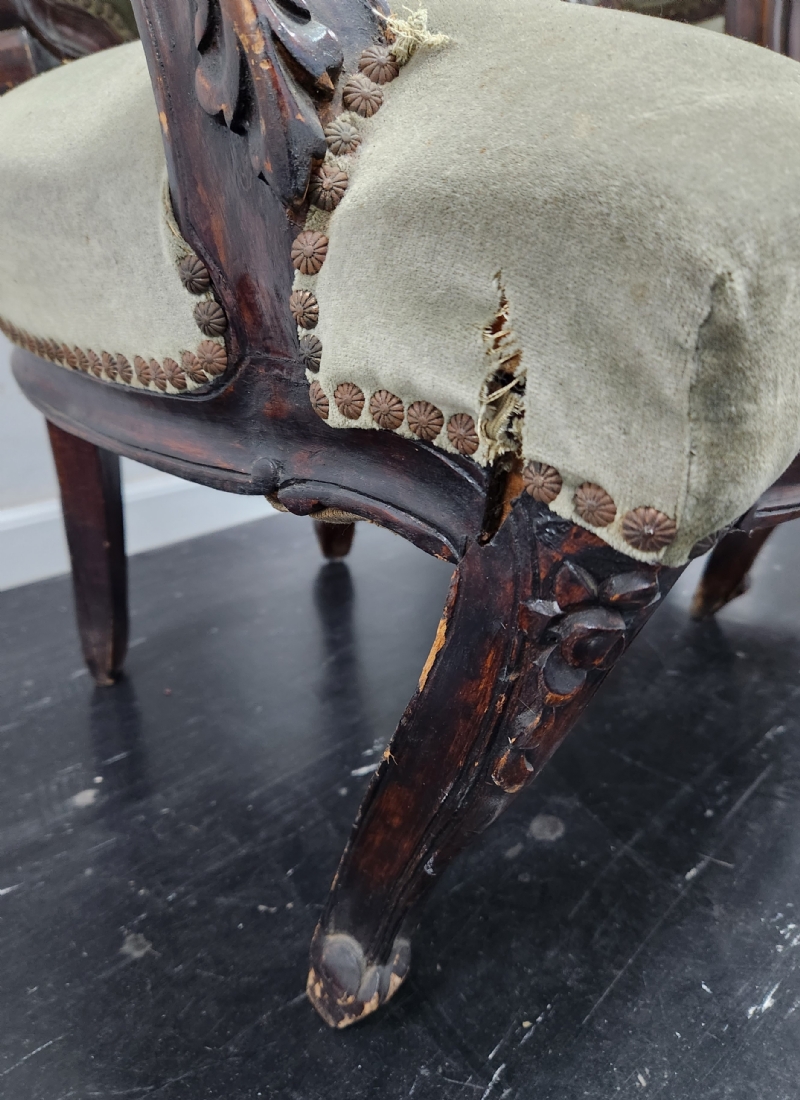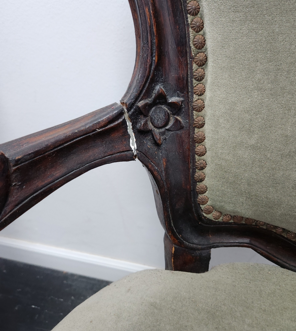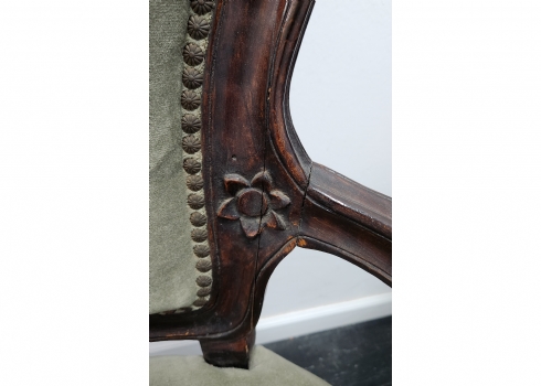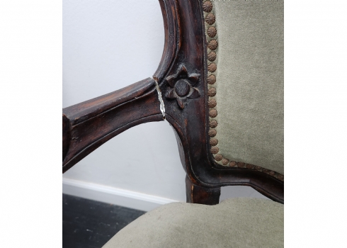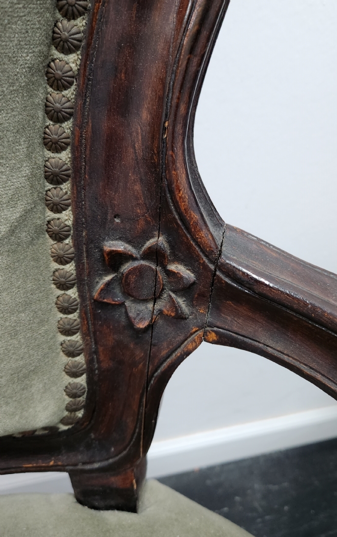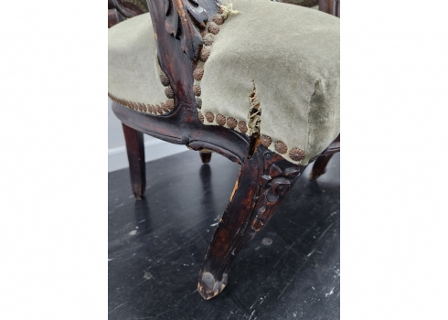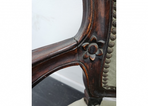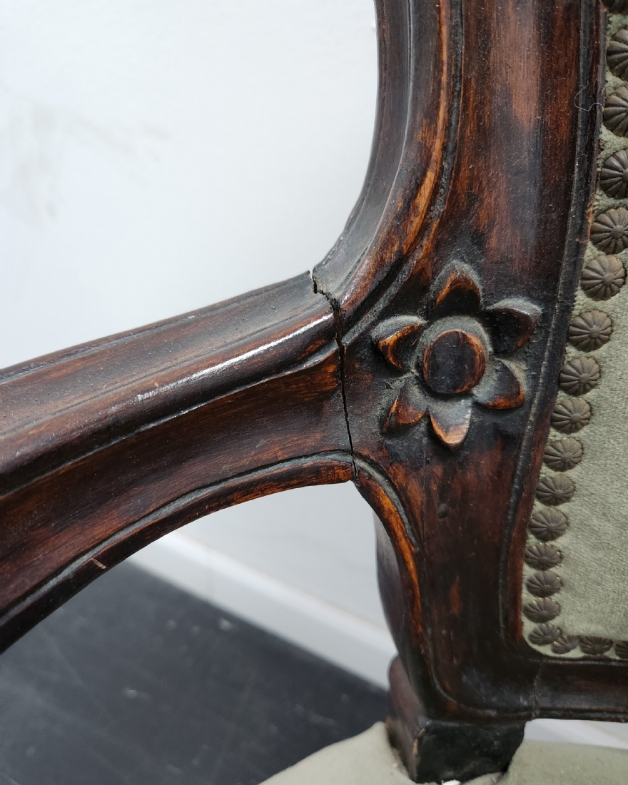 זוג כורסאות עתיקות ויפות עשויות עץ מגולף וריפוד בד בגוון אפור כחלחל/ירקרק, מצב בהתאם לגיל ופגמים רבים: תיקון למשענת היד, שתי משענות יד מתפרקות, משענת יד אחת זקוקה להידוק, ו2 רגליים שבורות וזקוקות לתיקון, בגובה: 99 ס"מ, רוחב: 68 ס"מ, עומק: 53 ס"מ.