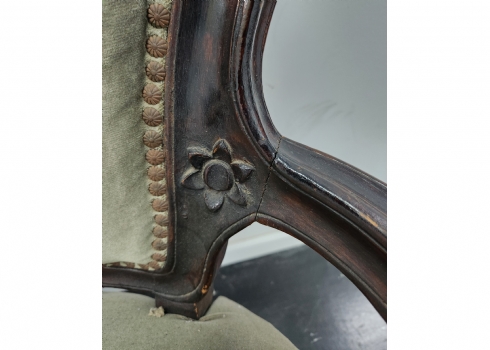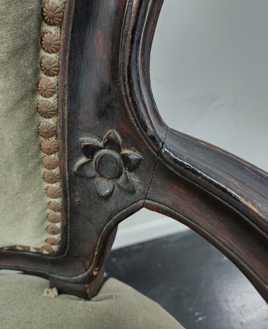 זוג כורסאות עתיקות ויפות עשויות עץ מגולף וריפוד בד בגוון אפור כחלחל/ירקרק