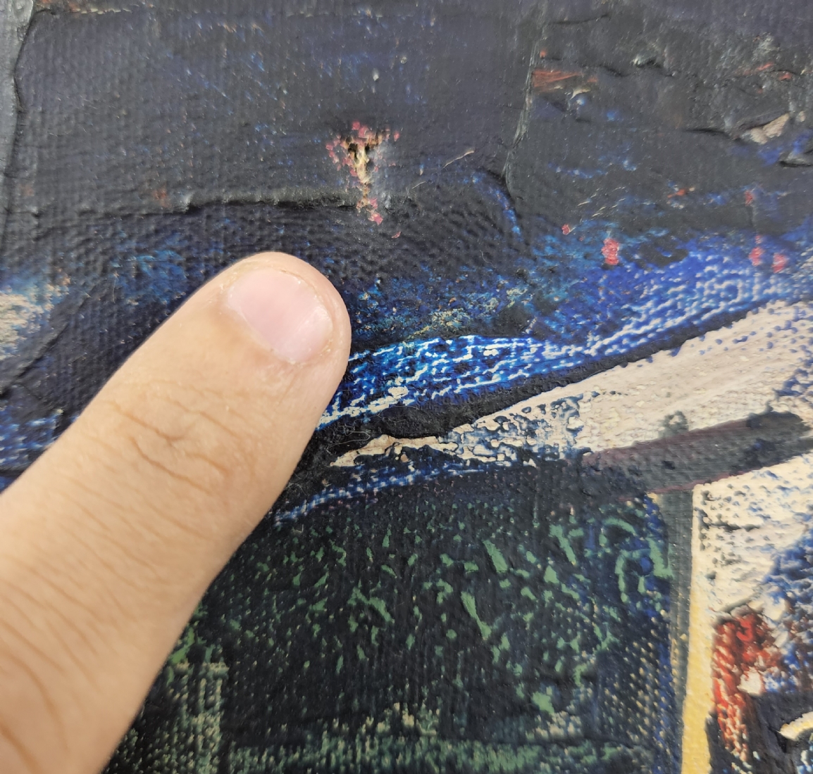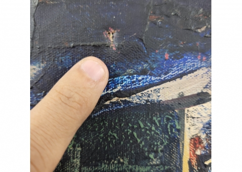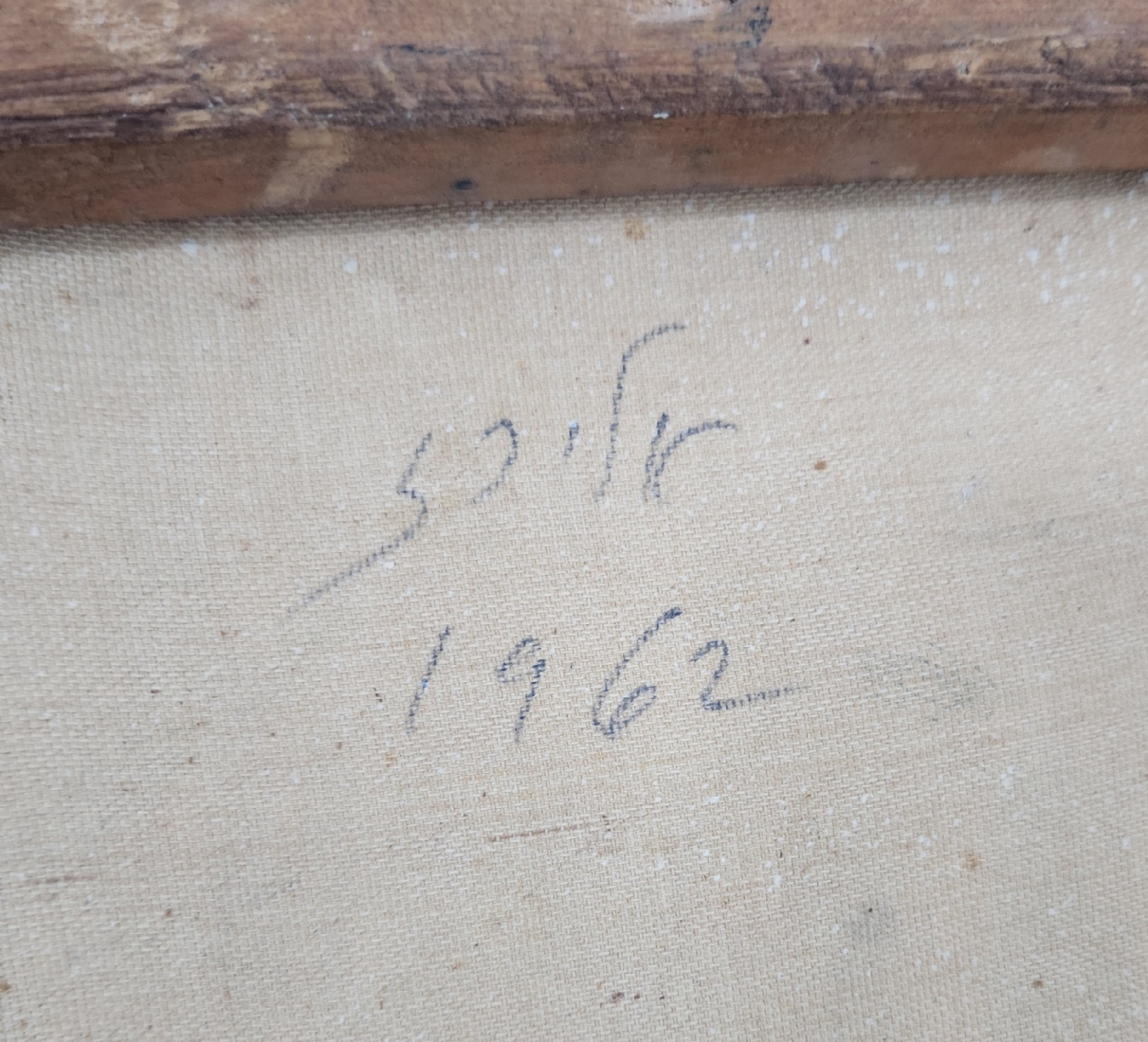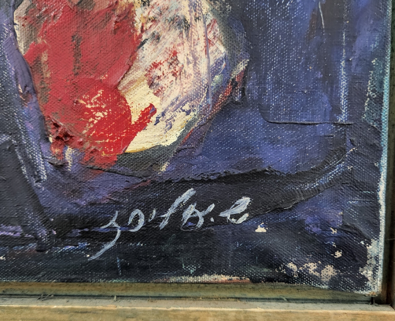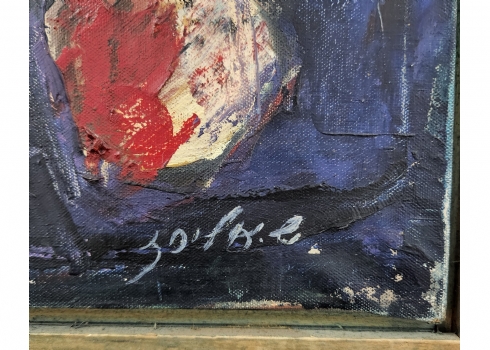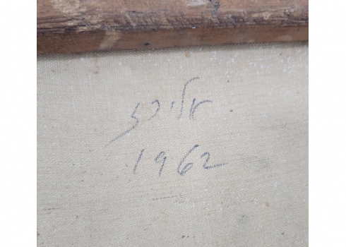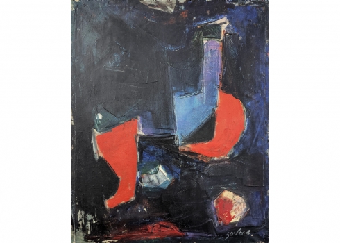 שלמה אלירז - 'שמש אדומה במרחב כחול' - ציור ישן, שמן על בד, חתום ומתוארך: 1962, פגם (חור קטן בבד), מידות: 60X50 ס"מ, מידות המסגרת: 65X54 ס"מ.