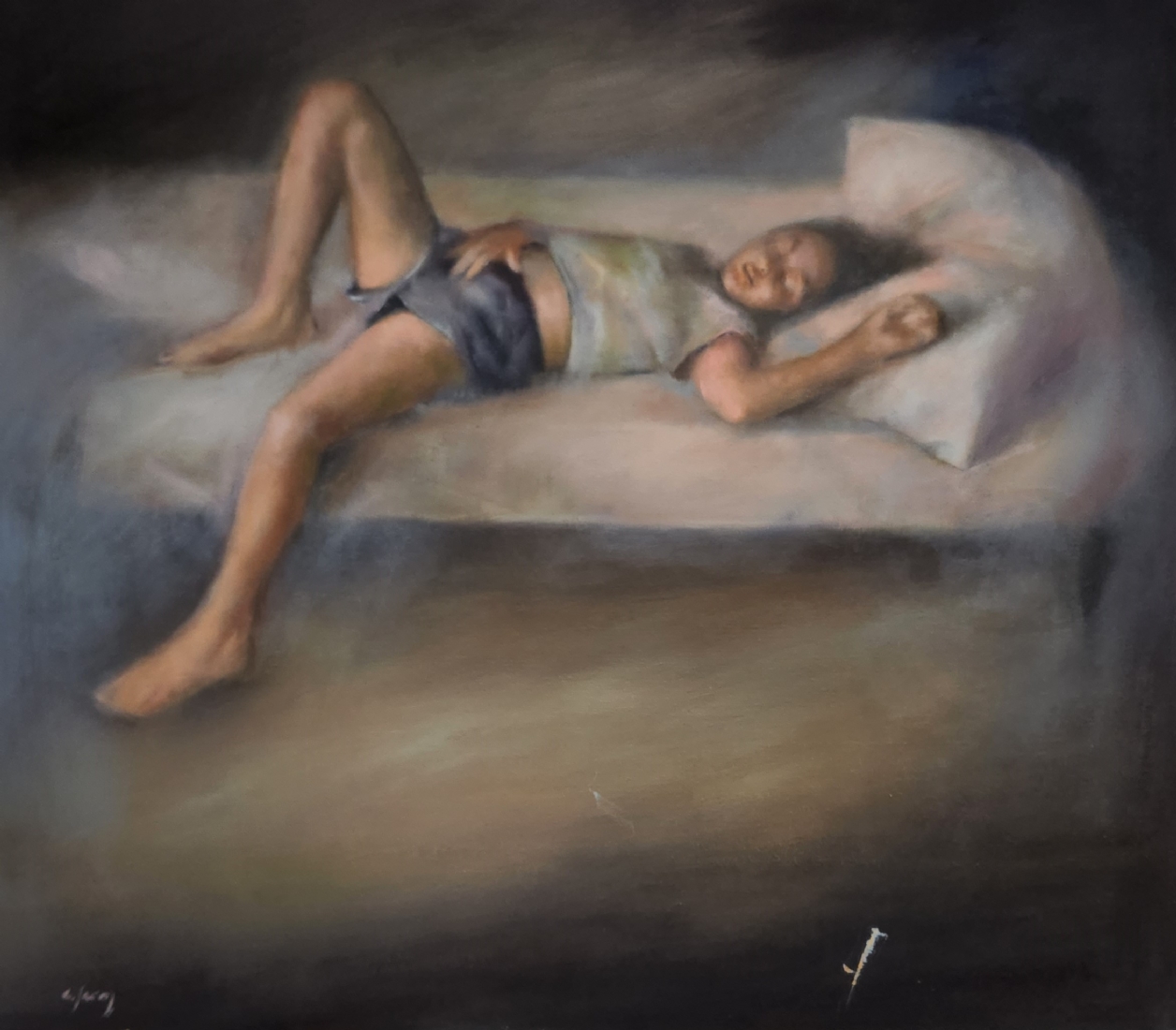 יעקב כרמלי (Jacob Carmely) - 'נערה נמה' - ציור גדול, שמן על בד, חתום, מידות הציור עצמו: 100X90 ס"מ.