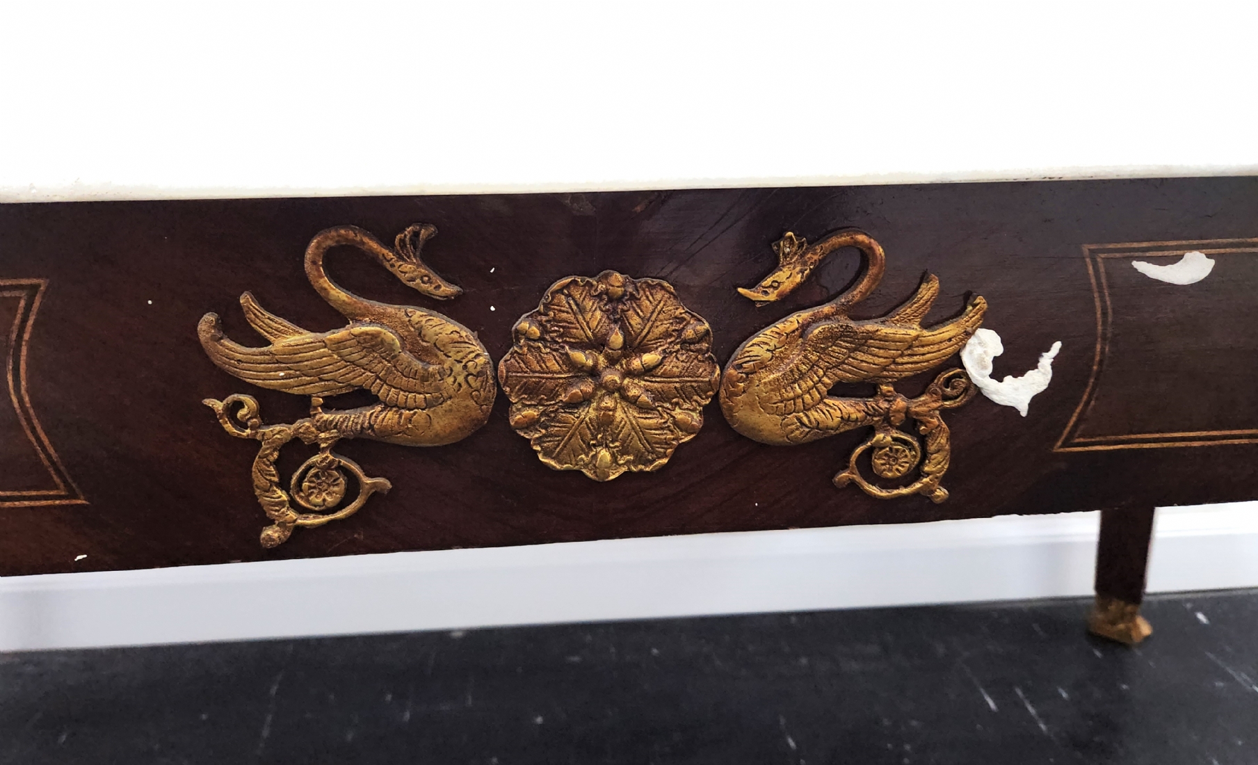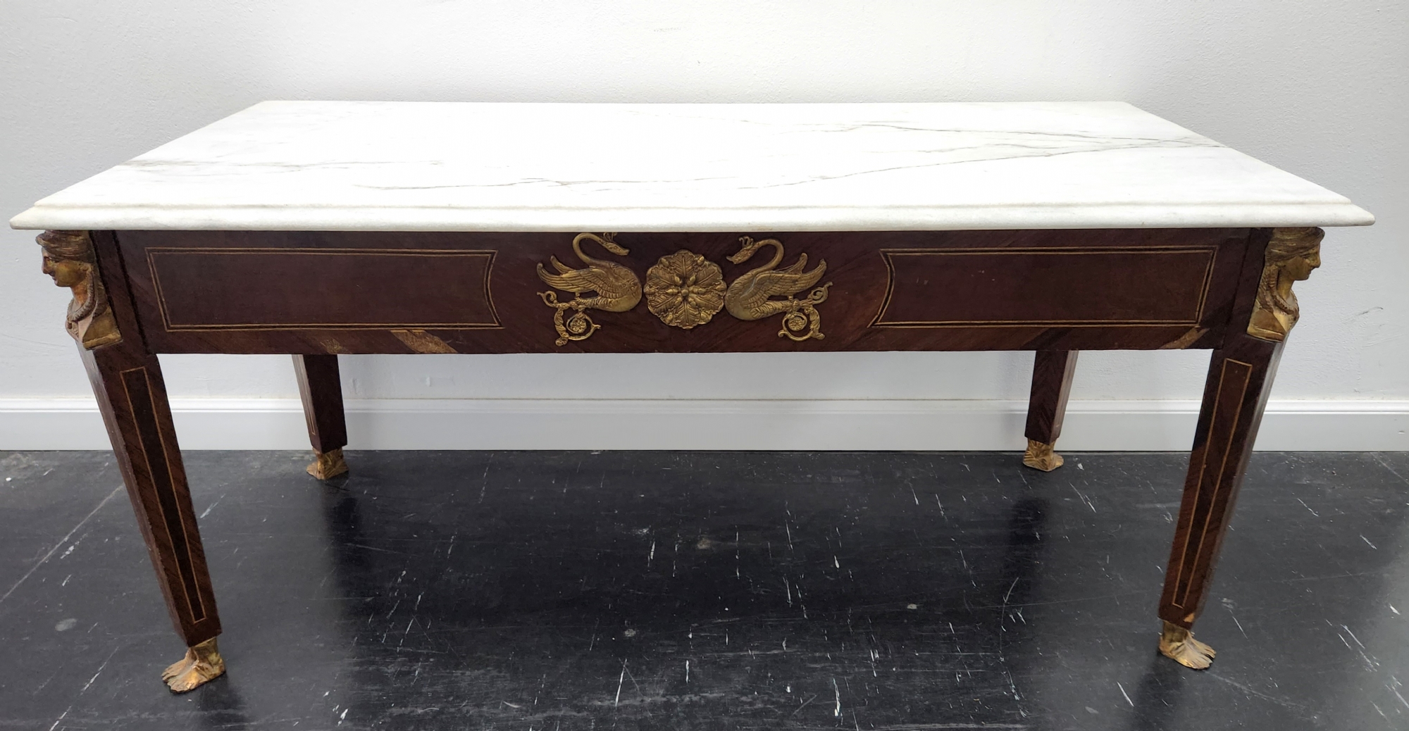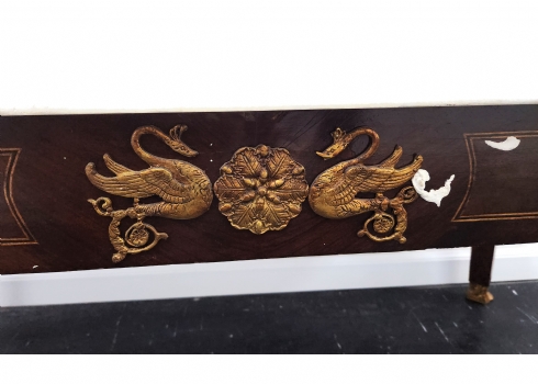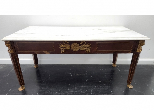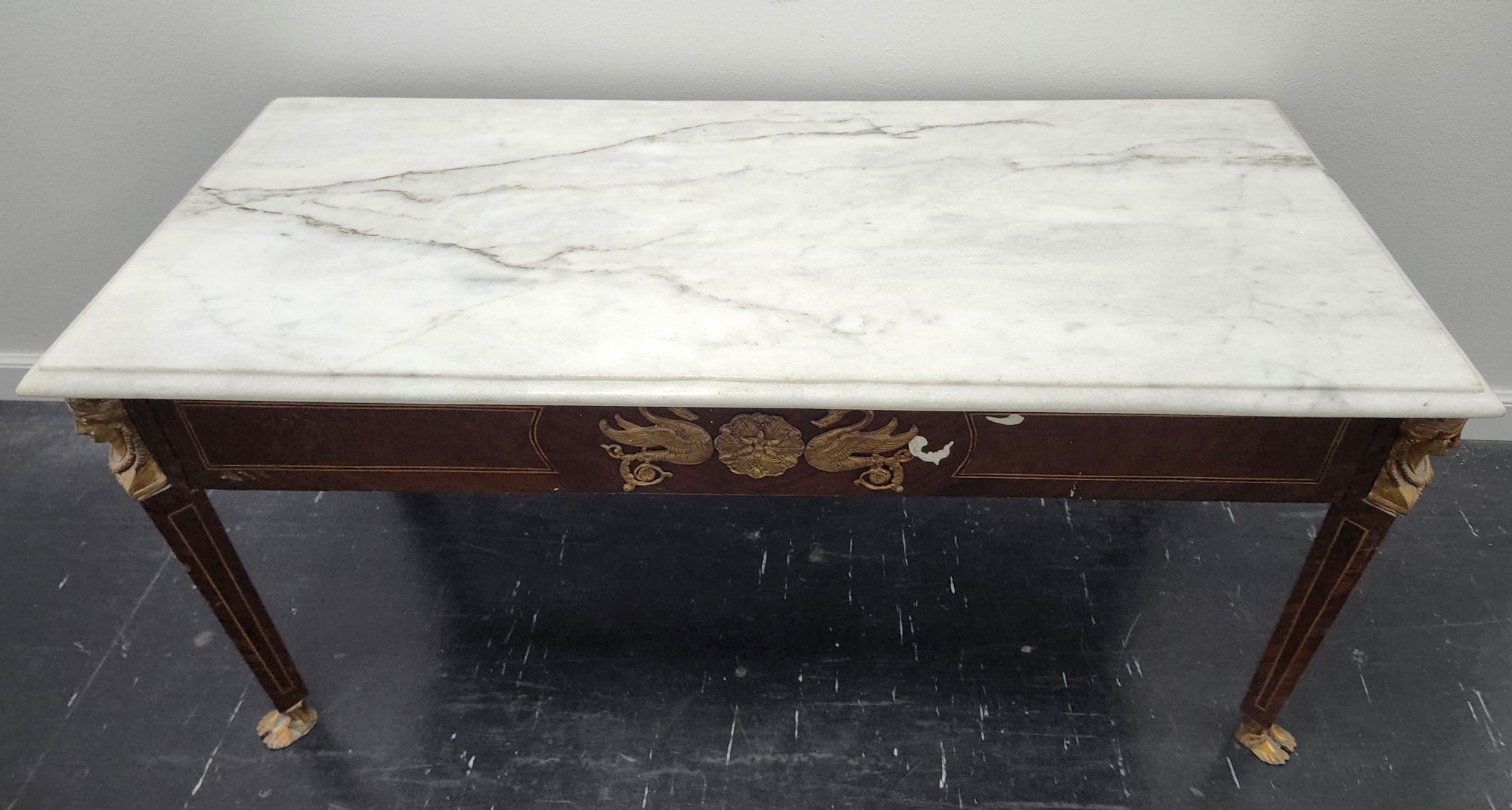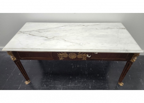 שולחן סלוני ישן משומש ובעל פגמים, בסגנון אמפיר צרפתי עתיק, עשוי עץ, עיטורי מתכת ומשטח עליון עשוי שייש, גובה השולחן כולל המשטח: 53 ס"מ, מידות המשטח העליון: רוחב 110 ס"מ, עומק 51 ס"מ