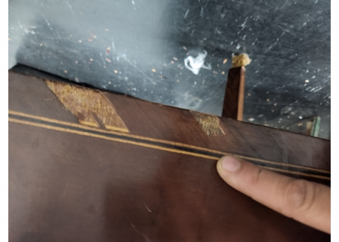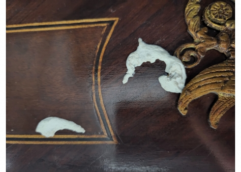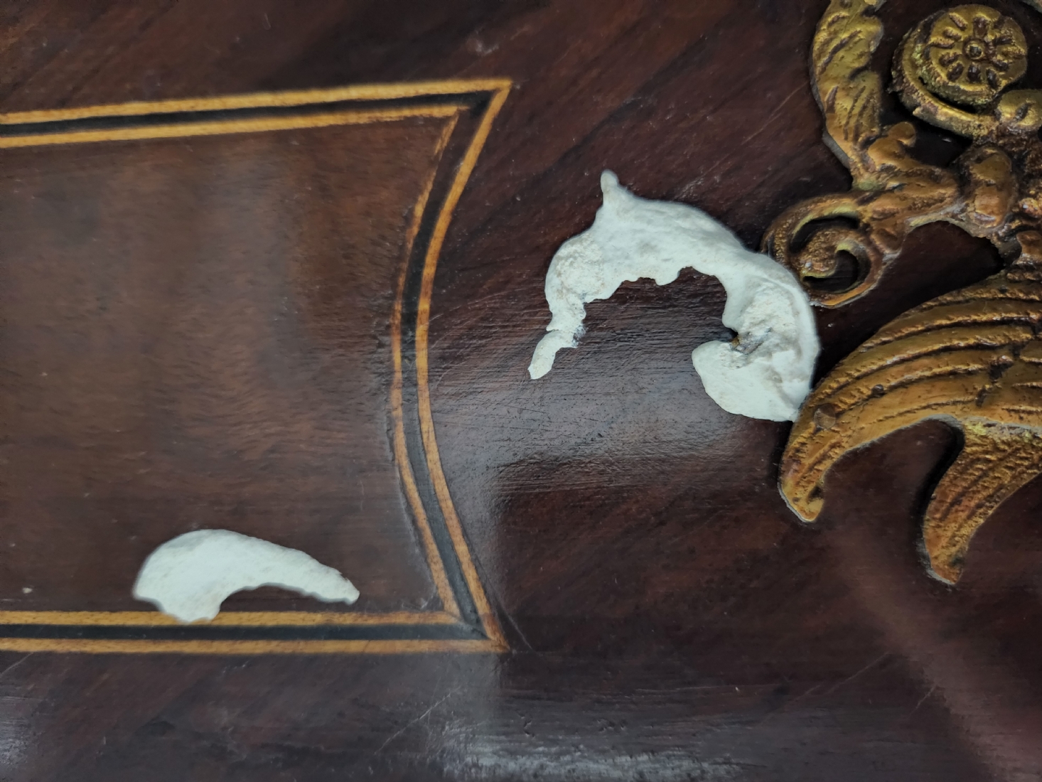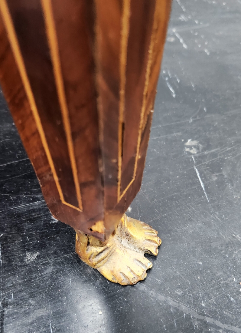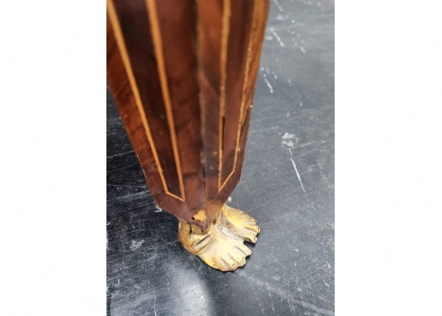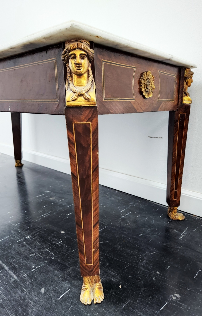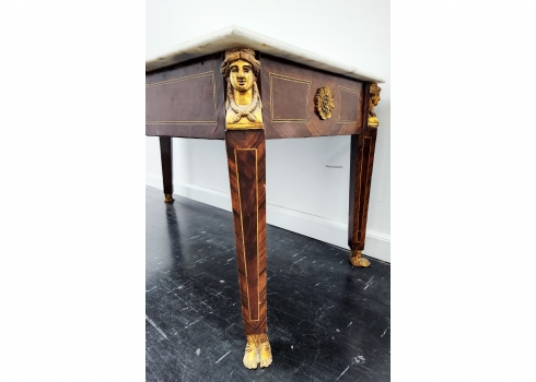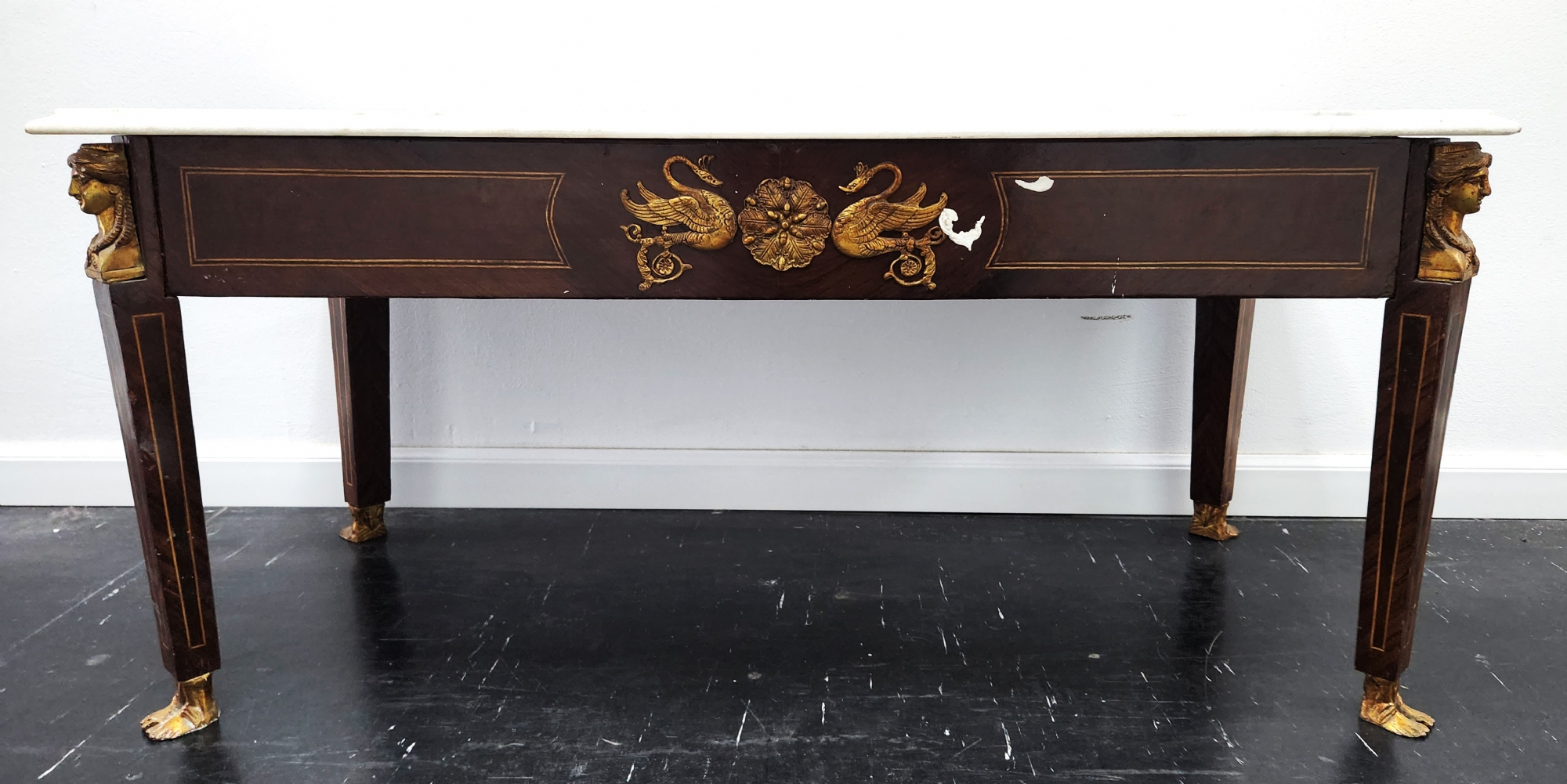 שולחן סלוני ישן משומש ובעל פגמים, בסגנון אמפיר צרפתי עתיק, עשוי עץ, עיטורי מתכת ומשטח עליון עשוי שייש, גובה השולחן כולל המשטח: 53 ס"מ, מידות המשטח העליון: רוחב 110 ס"מ, עומק 51 ס"מ