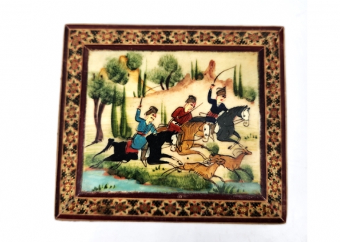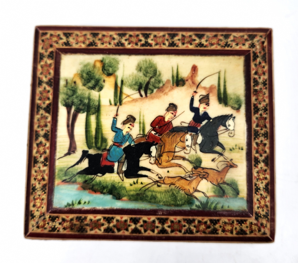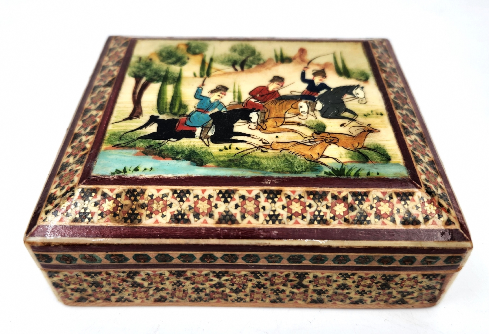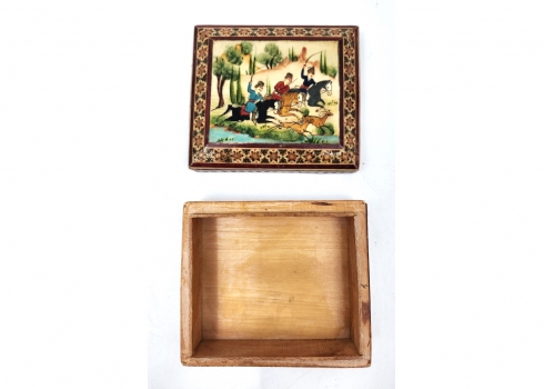 קופסה פרסית שולחנית ישנה, עשויה עץ, מעוטרת ציורי יד ושיבוץ מסוג 'קאטם קארי' (Khatam Kari), גובה: 4.5 ס"מ, מידות הבסיס: 10.5X12 ס"מ.