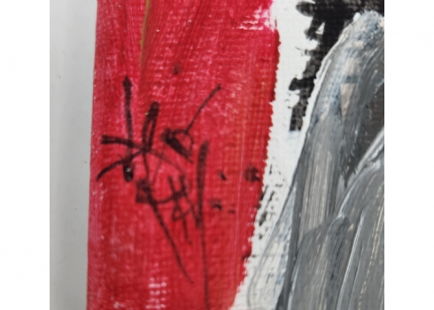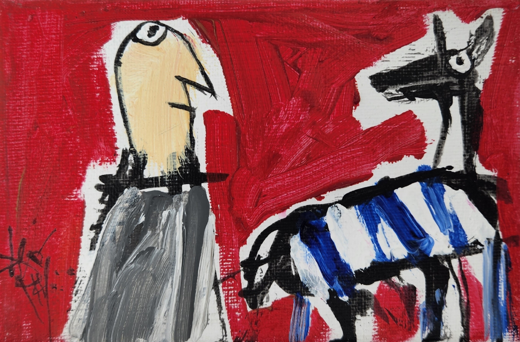 לאו ריי (Leo Ray) - 'גבר וזברה כחולה' - ציור קטן, שמן על בד, חתום