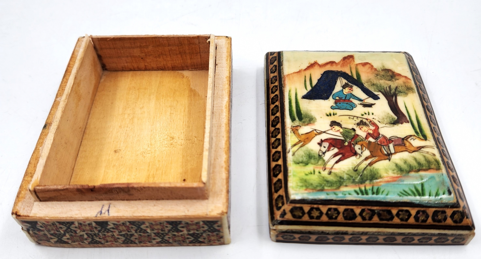 תיבת עץ פרסית ישנה מעוטרת בשיבוץ בטכניקת מסוג 'קאטם קארי', 'Khatam Kari' ומצוירת ביד, גובה: 4 ס"מ, רוחב: 10.5 ס"מ.