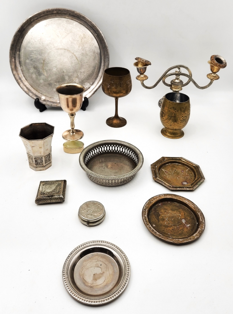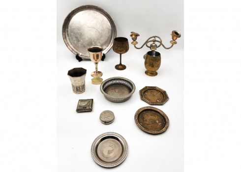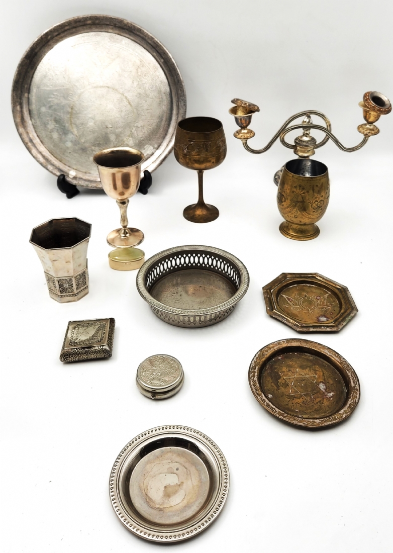 לוט של 12 פרטי מתכת ישנים שונים ויצרנים שונים, חלכם מצופים כסף וחתומים, קוטר המגש: 28.5 ס"מ, רוחב הפמוט: 26 ס"מ.