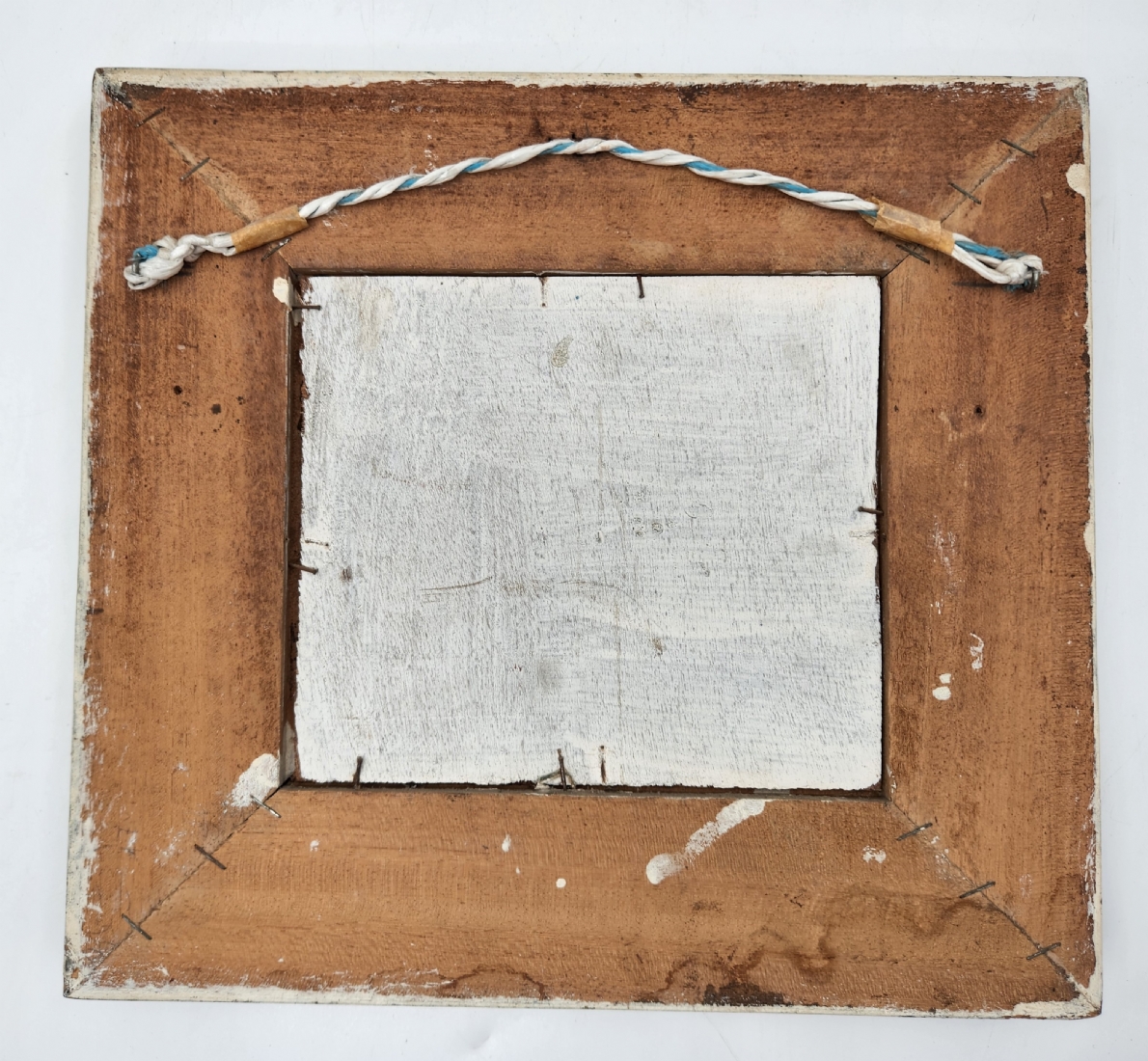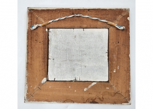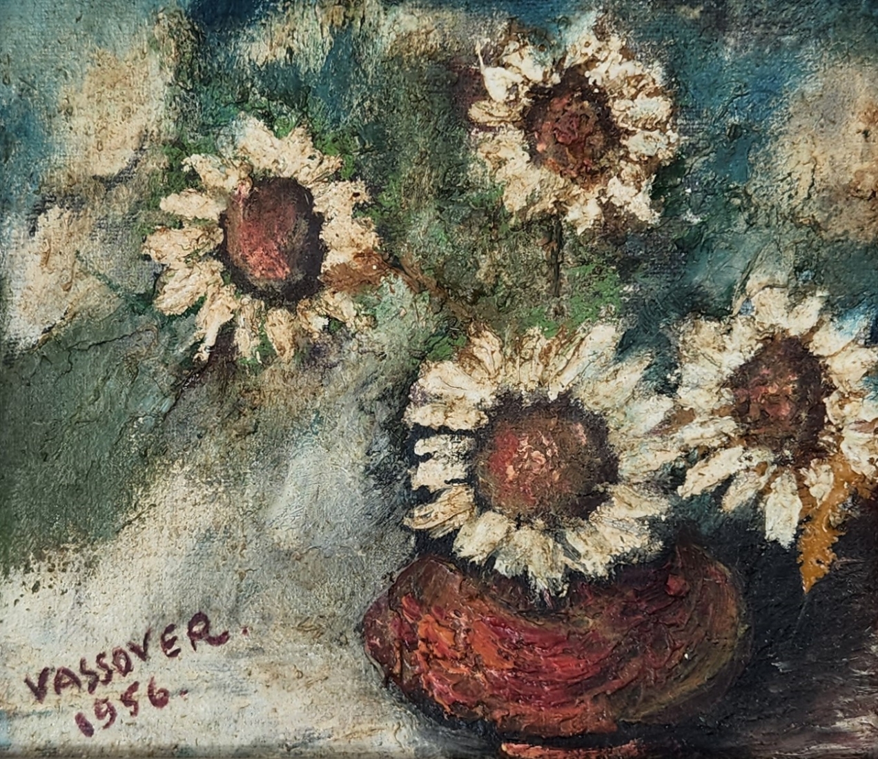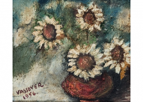 יעקב וסובר (Yaakov Vassover) - 'פחים בכד חום' - ציור ישן, שמן על בד מוצמד ללוח, חתום ומתוארך: 1956, מידות: 14X16 ס"מ, מידות המסגרת: 28X31 ס"מ.