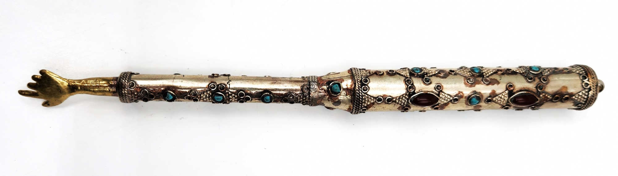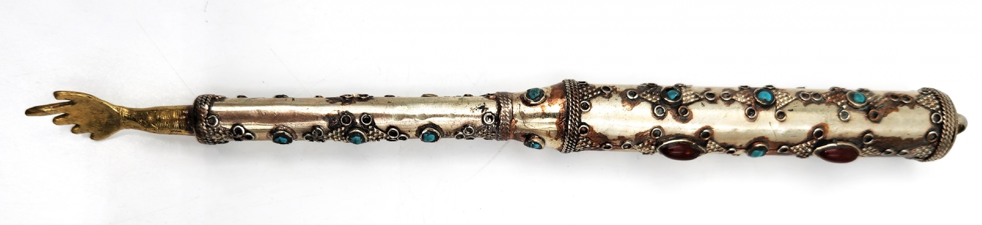 אצבע דקורטיבית לספר תורה, בסגנון טורקמני, עשויה מתכת מצופה כסף ומשובצת אבנים צבעוניות בליטוש קאבושון, אורך: 22.5 ס"מ.